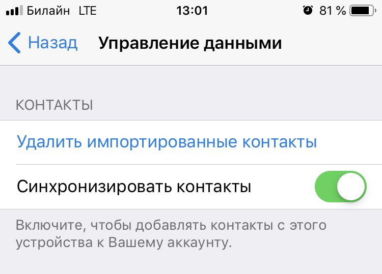 Настройки > конфиденциальность > управление данными > удалить синхронизированные контакты