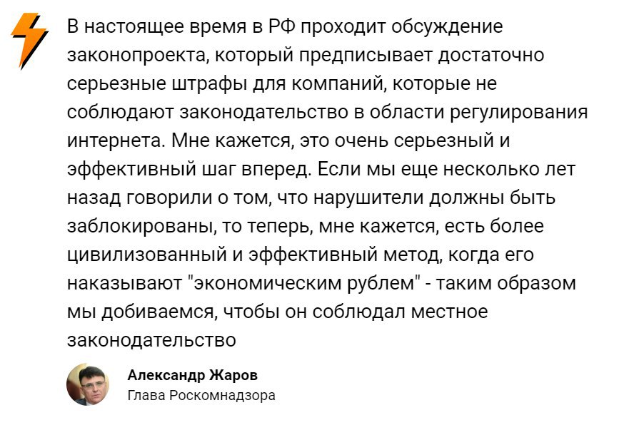 Жаров заявил, что Россия перейдёт от мер блокировки к штрафованию нарушителей в интернете