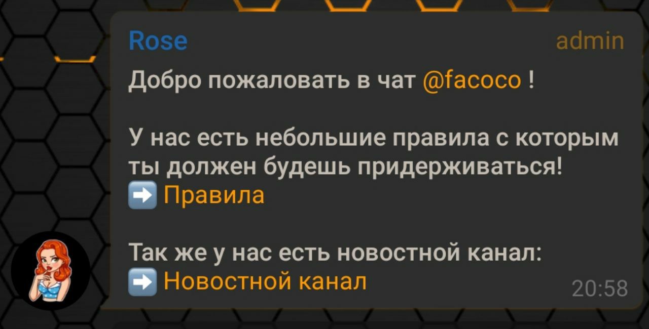 Да и правила есть, вон, бот об этом с порога верещит. Меня правда завесило еще до ссылки на правила.
