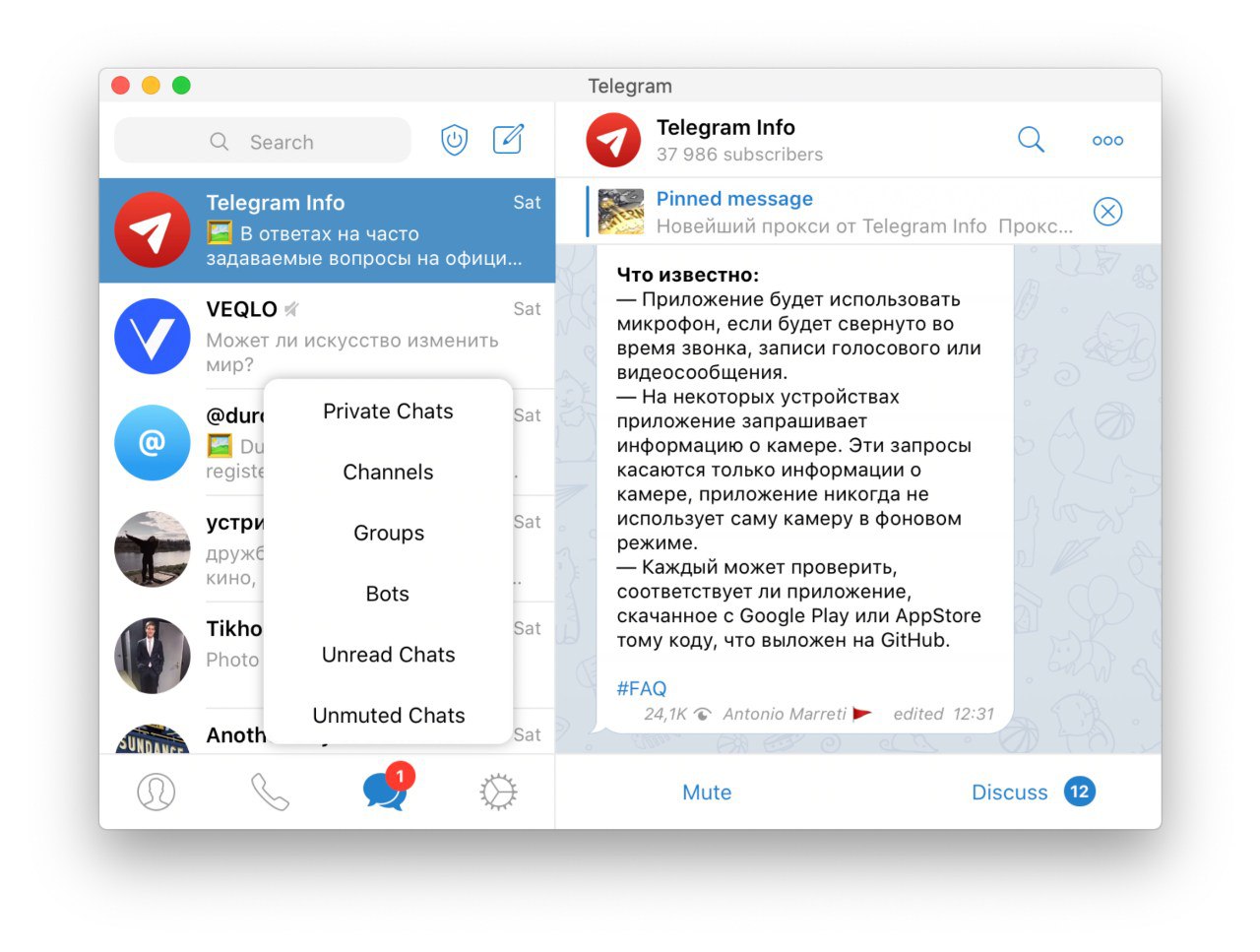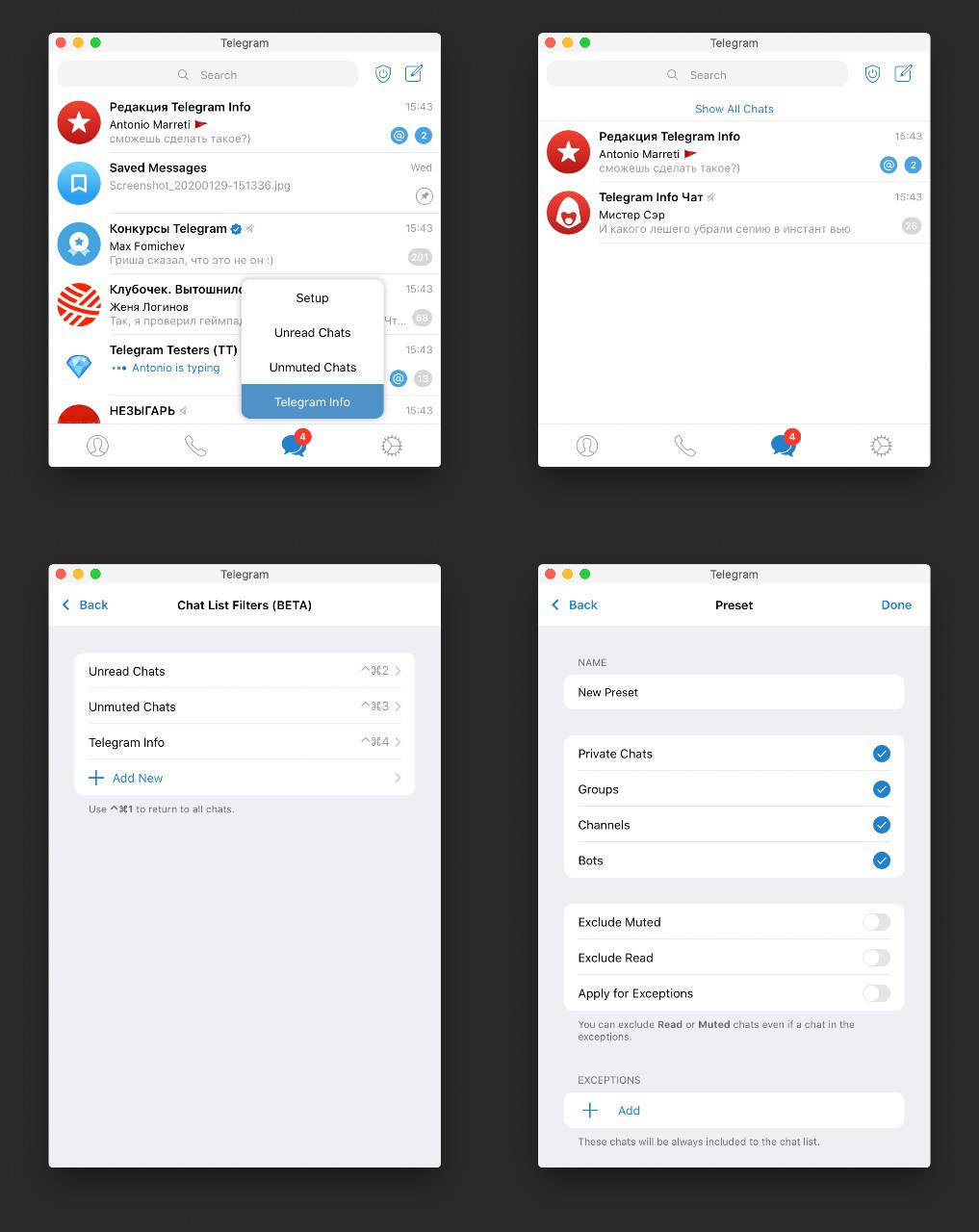 Beta-версия Telegram для macOS получила функцию разделния чатов по типу. Для вызова фильтра нажмите правой кнопкой мыши по вкладке «Чаты».