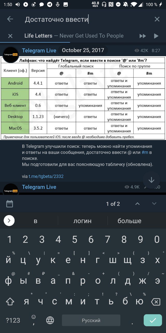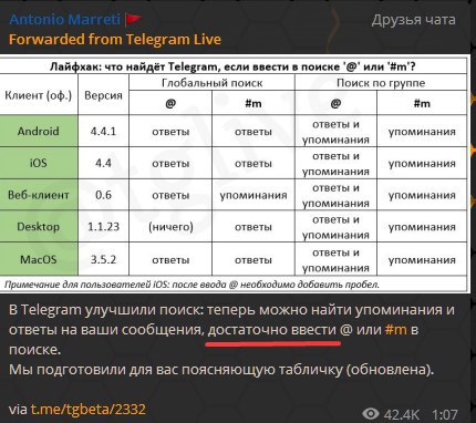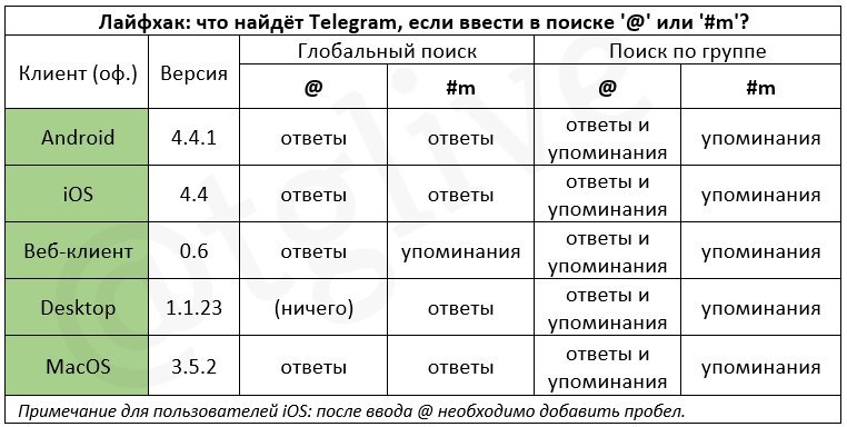 В Telegram улучшили поиск: теперь можно найти упоминания и ответы на ваши сообщения, достаточно ввести @ или #m в поиске.