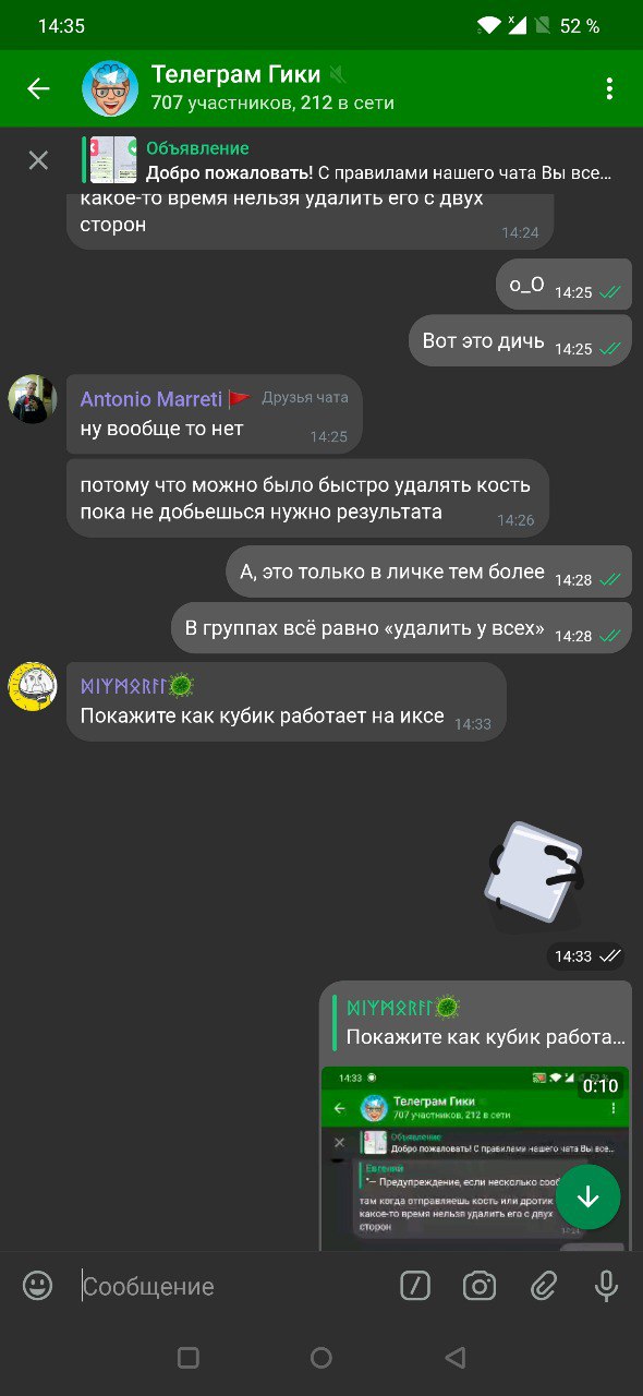 — Результат отправленной кости и дротика в уведомлении и превью чатов в списке диалогов.