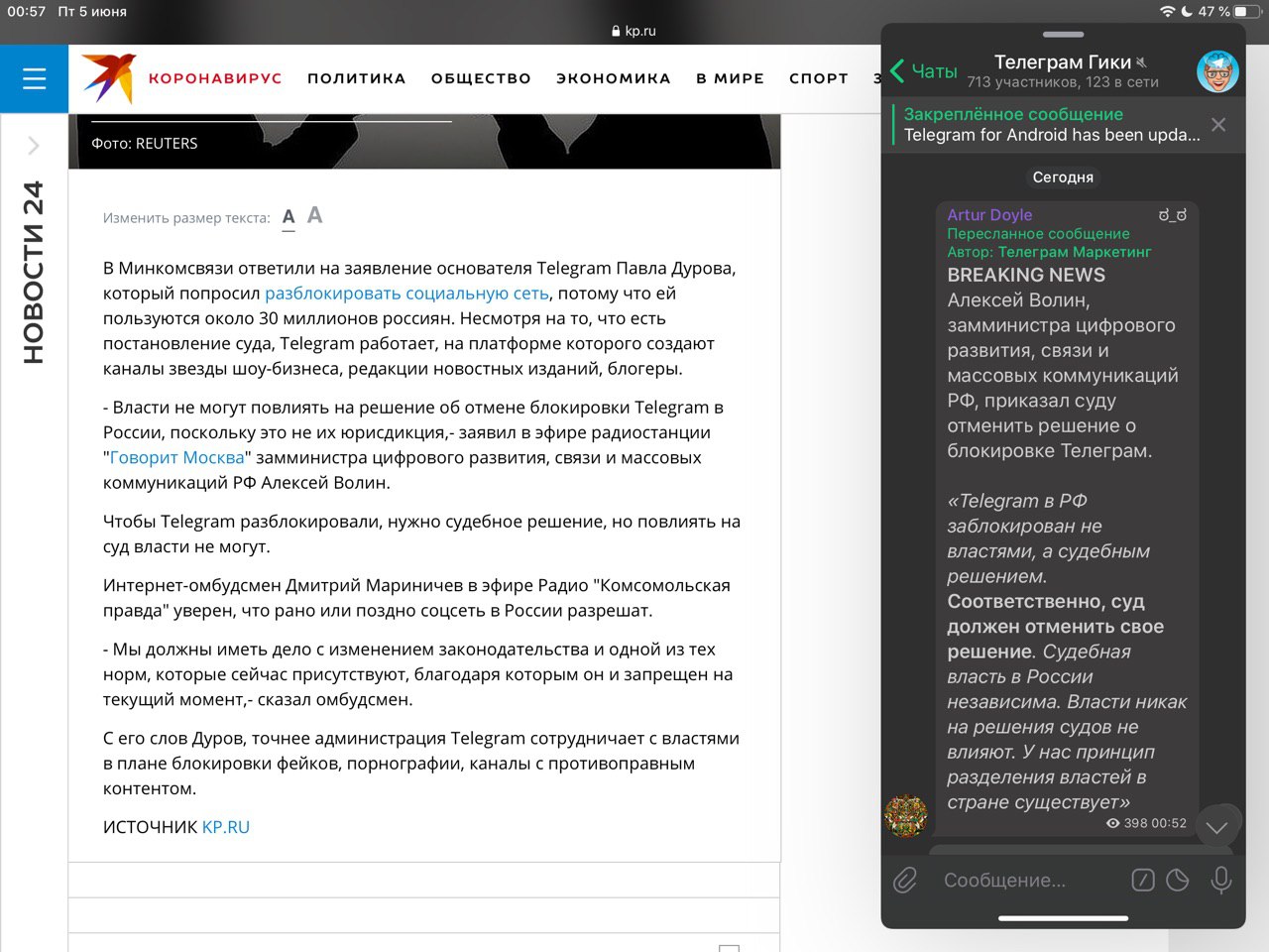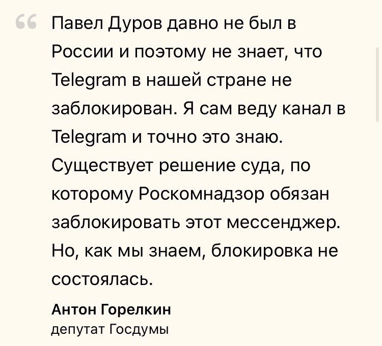 «Telegram в РФ заблокирован не властями, а судебным решением. Соответственно, суд должен отменить свое решение. Судебная власть в России независима. Власти никак на решения судов не влияют. У нас принцип разделения властей в стране существует»