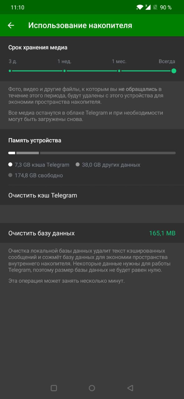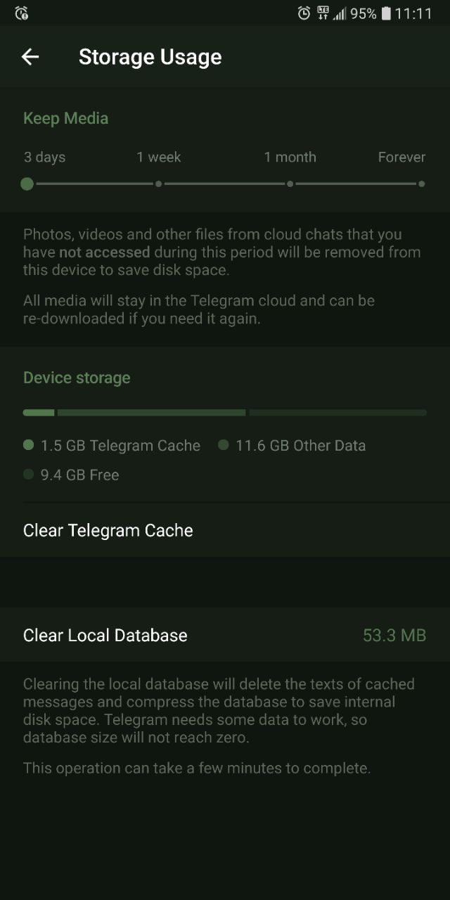 "Cache management interfaces on Android got a facelift as well. Not only can you keep Telegram's storage footprint on your device incredibly small – you can do it in style. See Settings > Data and Storage > Storage Usage"