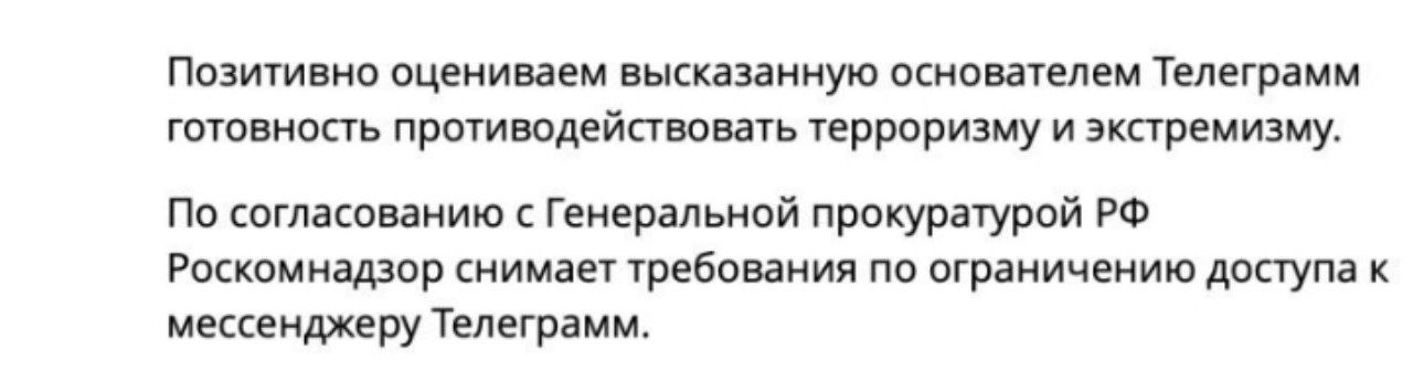Роскомнадзор по согласованию с Генеральной прокуратурой РФ снимает ограничения по доступу к Telegram. Поздравляем 🥳