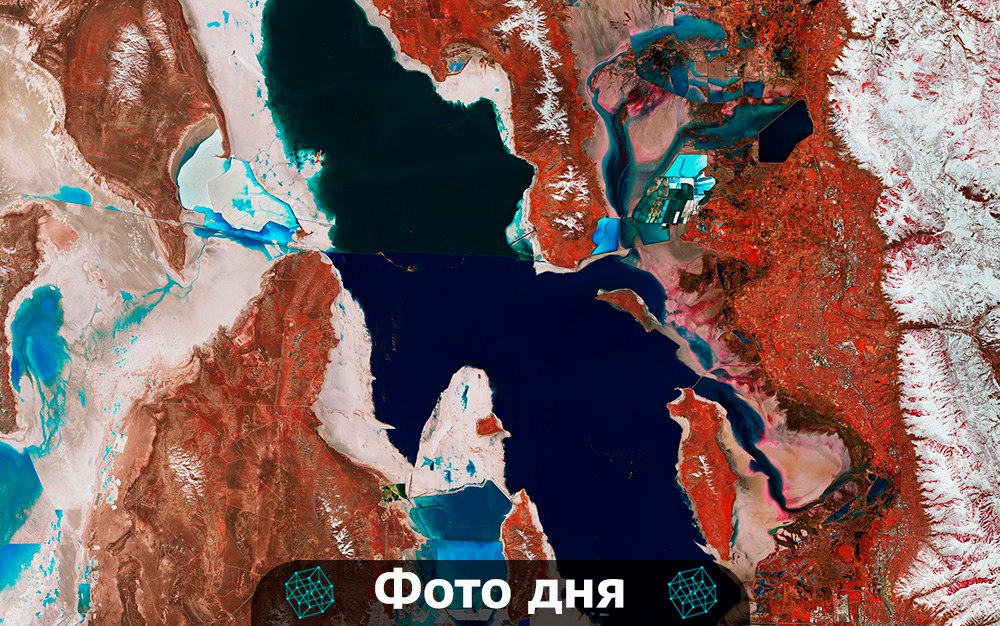 Перед вами снимок, который сделан миссией Сopernicus Sentinel, запущенной Европейским космическим агентством. На нем мы видим Большое Соленое озеро в штате Юта, США. Хорошо заметна разница в цветах. Прямая линия, пересекающая озеро — это дамба с железной дорогой, препятствующая перемешиванию воды. Поэтому северная часть более соленая, а южная — более пресноводная.