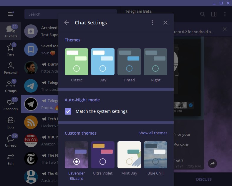Ночной режим в телеграме включается вместе с ночным режимом в системе.