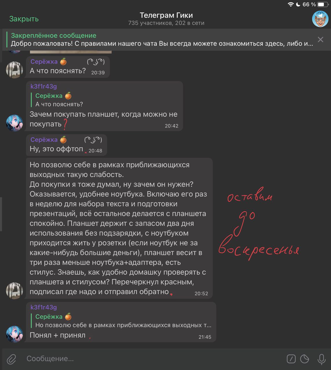 До покупки я тоже думал, ну зачем он нужен? Оказывается, удобнее ноутбука. Включаю его раз в неделю для набора текста и подготовки презентаций, всё остальное делается с планшета спокойно. Планшет держит с запасом два дня использования без подзарядки, с ноутбуком приходится жить у розетки (если ноутбук не за какие-нибудь большие деньги), планшет весит в три раза меньше ноутбука+адаптера, есть стилус. Знаешь, как удобно домашку проверять с планшета и стилусом? Перечеркнул красным, подписал где надо и отправил обратно