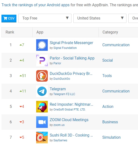 Telegram вышел на второе место по числу скачиваний в США — рост загрузок приложения связывают с блокировкой Трампа в твиттере и запретом соцсети Parler, популярной среди сторонников президента.