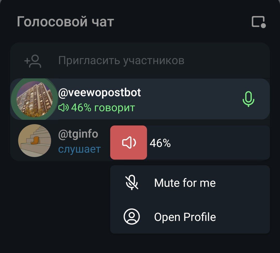 Изменение громкости отдельных участников голосового чата в Telegram для Android
