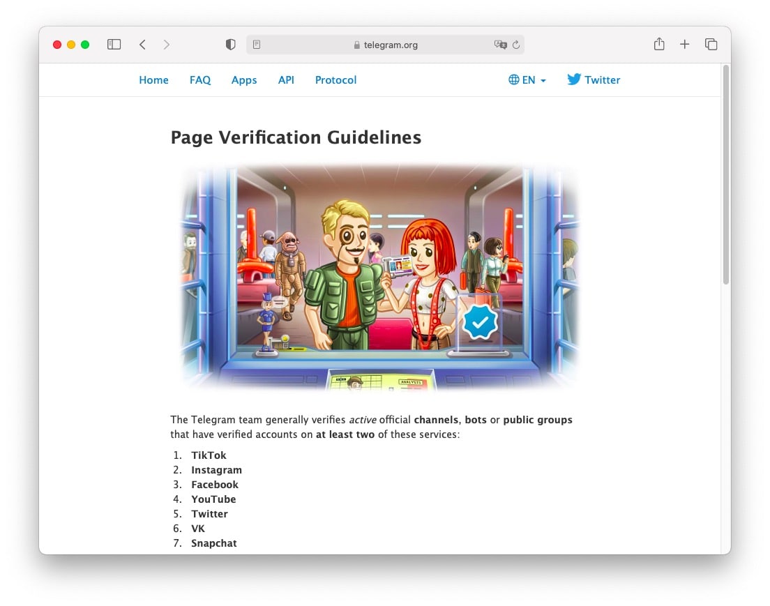 Не так давно, команда мессенджера выдавала верификацию только по собственному усмотрению. В прошлом году Telegram либерализировал этот процесс, разрешив подтверждать важность своих каналов и чатов через @VerifyBot наличием верификации на таких платформах как Instagram, Facebook, Twitter и/или страницы в Википедии. Получить верификацию на личный профиль до сих пор нельзя.