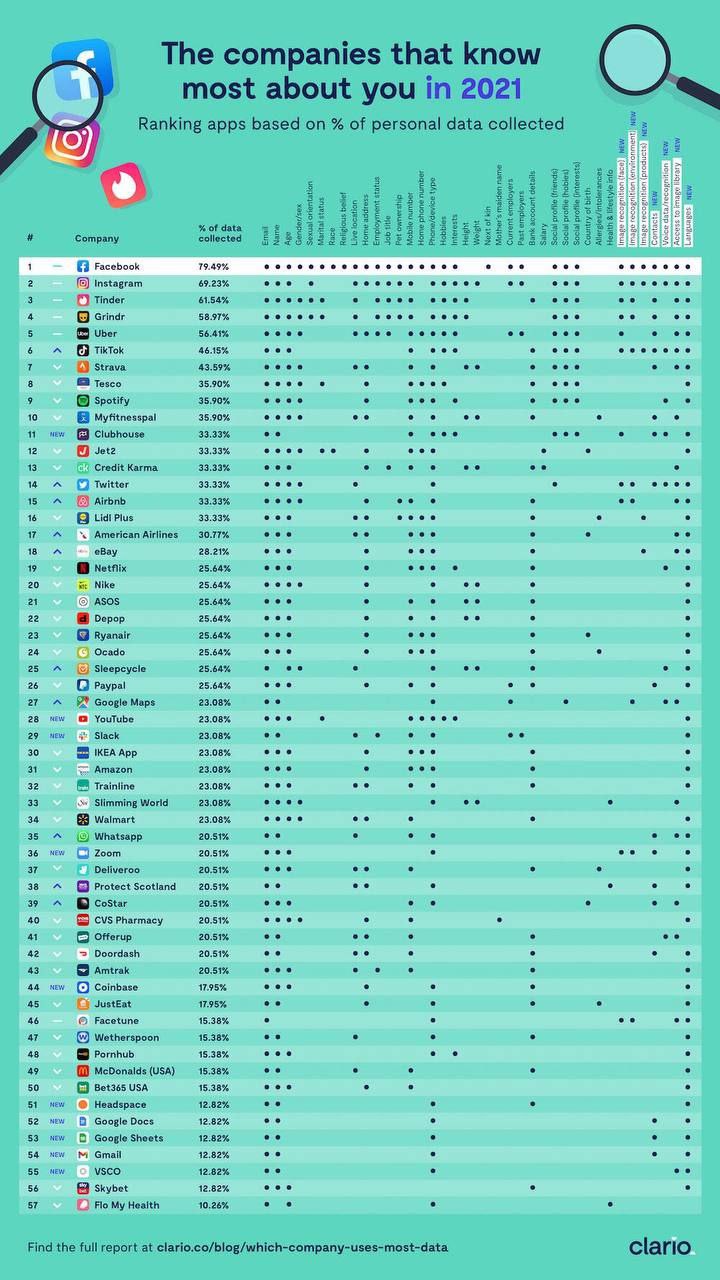 Какие приложения собирают больше всего ваших данных. Лидер Facebook, что логично, они всегда были жадными до пользовательских данных.
