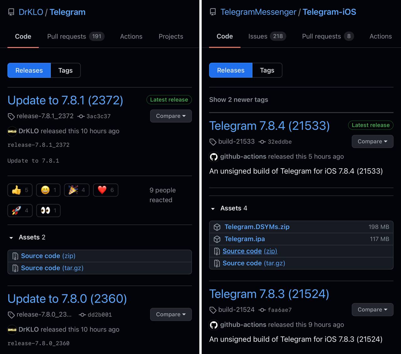 ⚒ The source code of Telegram for Android and iOS have been updated to v7.8.1 & 7.8.4