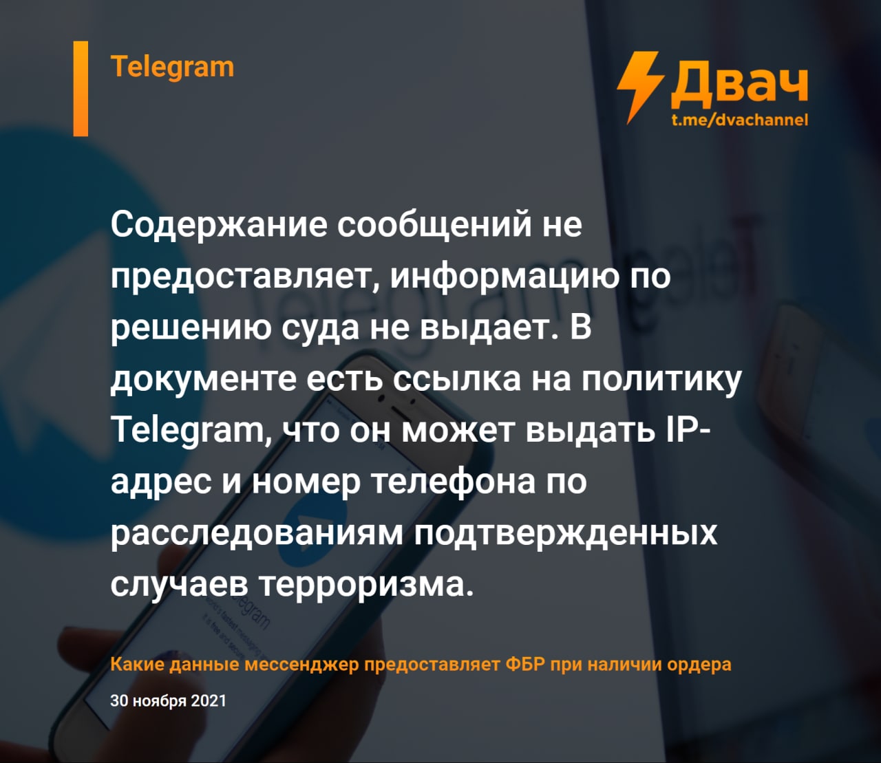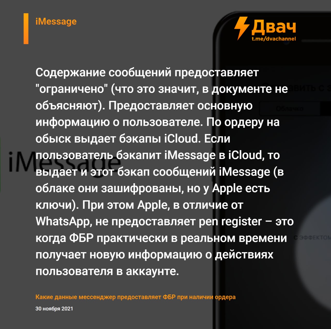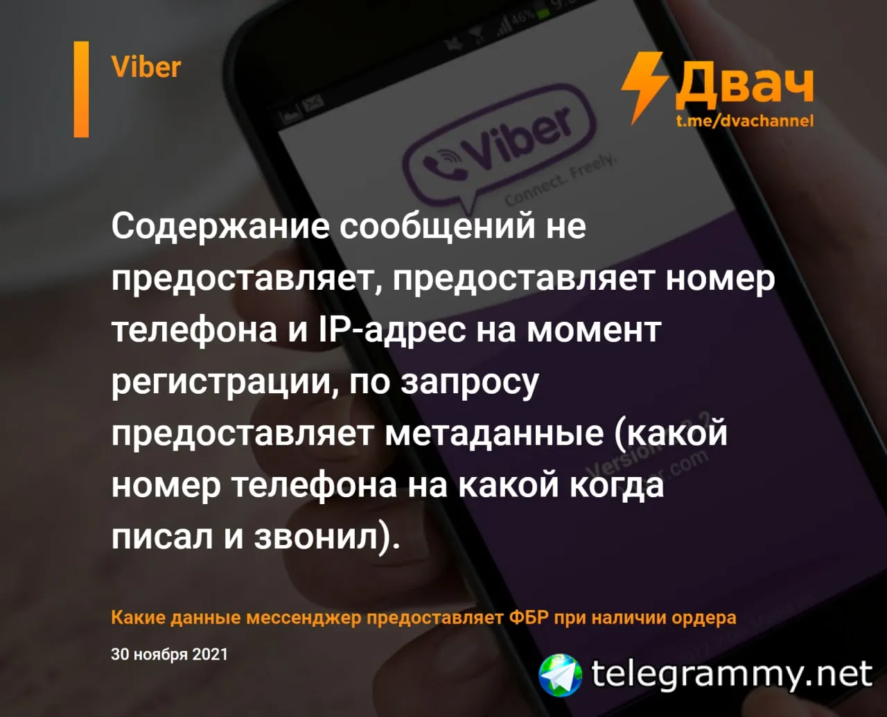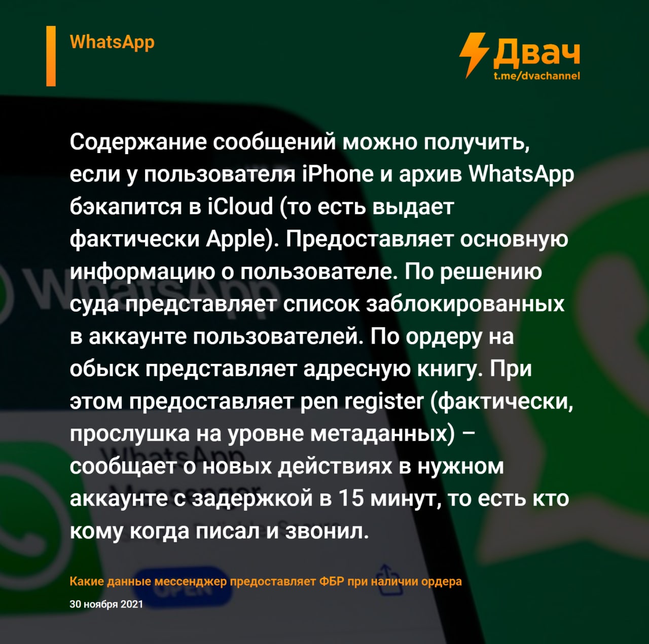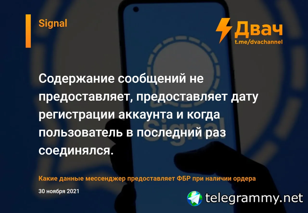 Организация Property of the People получила доступ к документам ФБР от ноября 2020 года, из которых стало известно, какие данные популярные мессенджеры передают спецслужбам США при наличии ордера (законным путём).