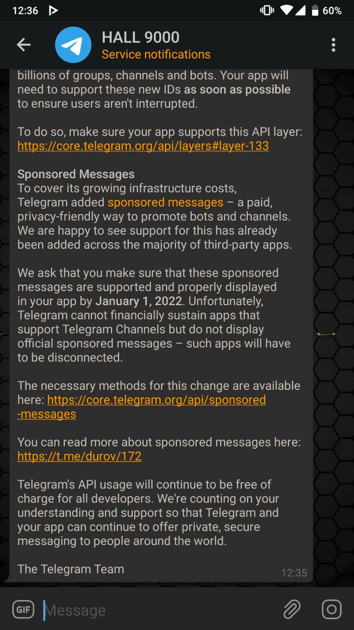 До 1 января 2022 мы просим Вас убедиться, что Ваше приложение поддерживает и корректно отображает рекламные сообщения. К сожалению, Telegram не сможет взять на себя расходы по поддержке приложений, в которых не отображаются рекламные сообщения, и будет вынужден отключить таким приложениям доступ к API.