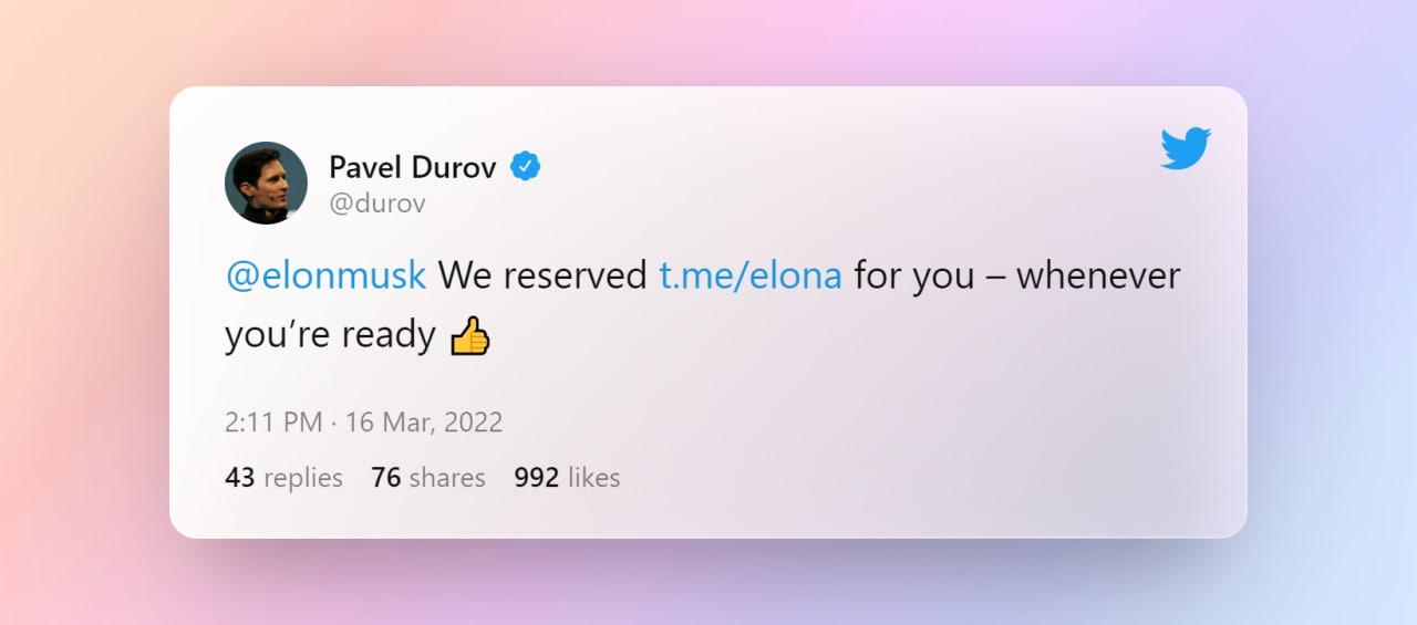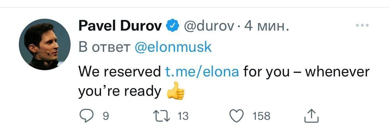 В своём Twitter-аккаунте Павел Дуров предложил Илону Маску зарегистрироваться в Telegram и зарезервировал для него адрес канала @elona.