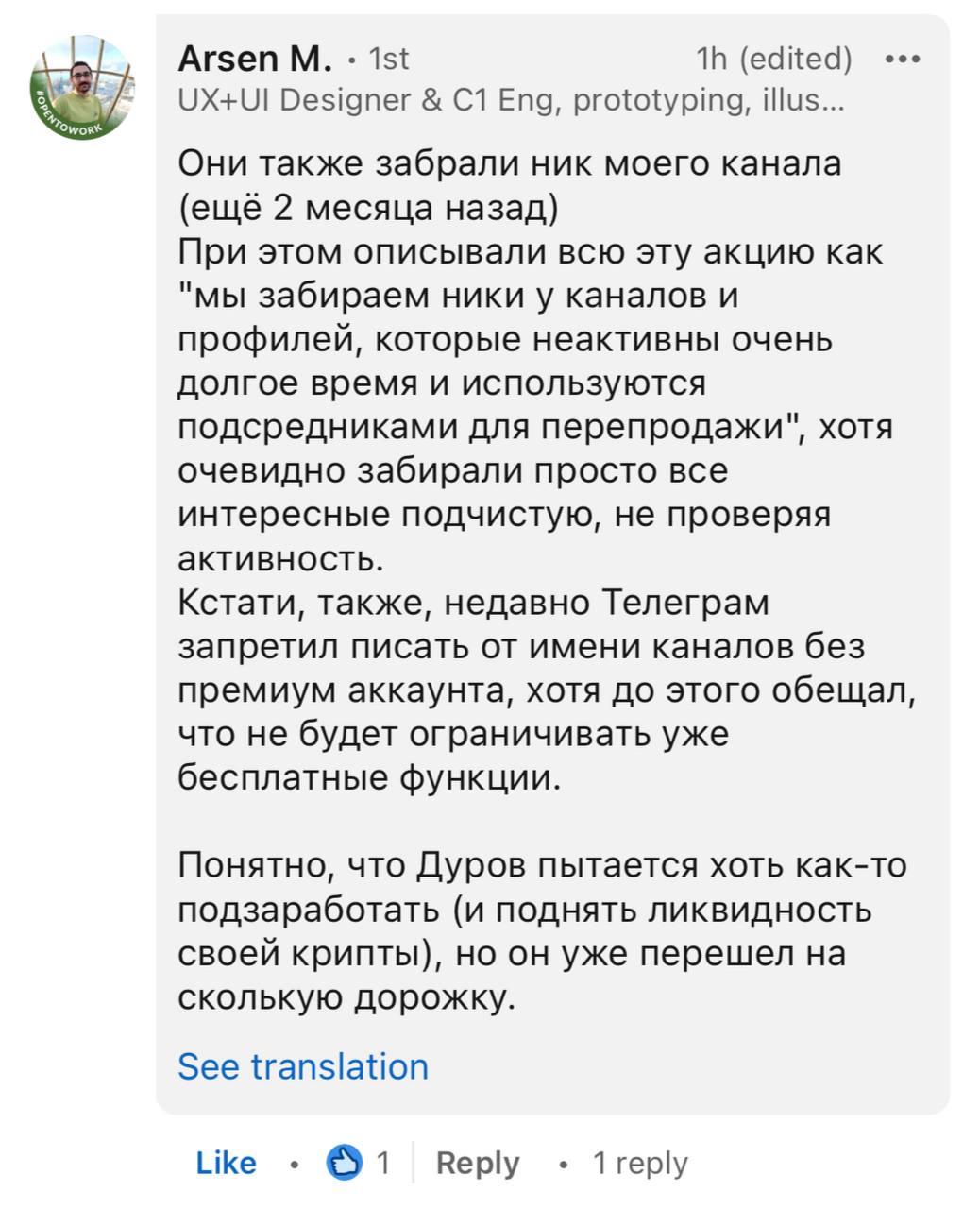 В нашем чате был юзернейм @designerschat . Пару месяцев назад он исчез, а теперь телеграм его продает за $500.