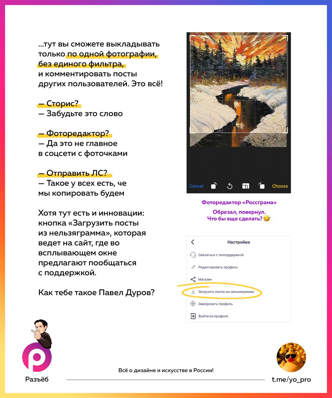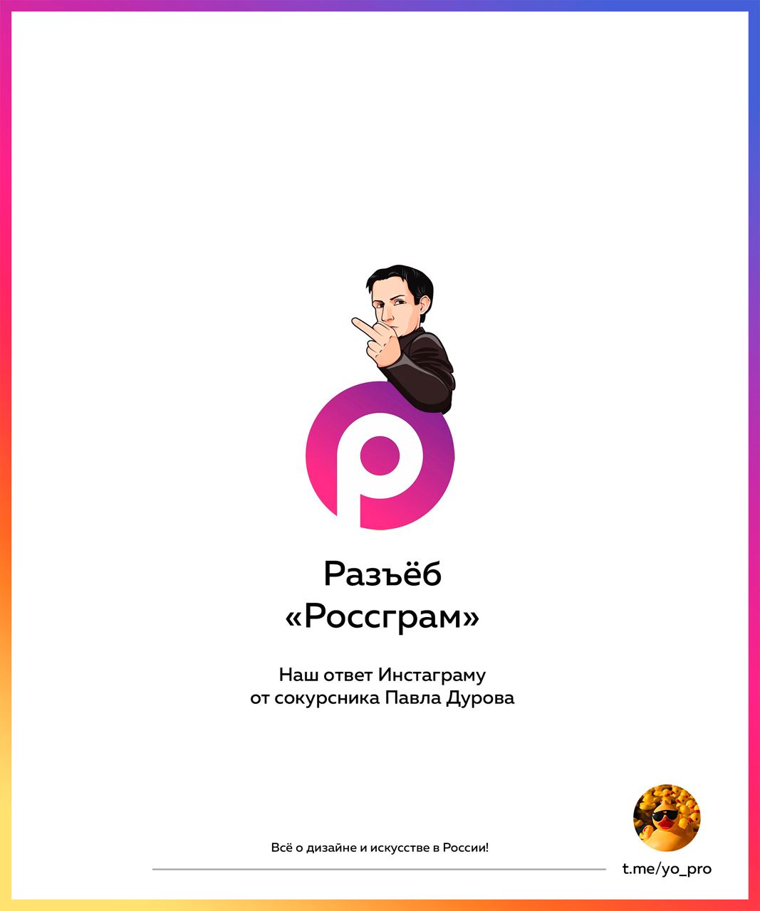 Сегодня я буду препарировать еще не вышедший, но уже сумевший стать мемом — «Наш ответ Инстаграму от сокурсника Павла Дурова» — отечественная соцсеть «Россграм». Именно это было написано первой строчкой на их сайте после ФИО создателя — человеку есть чем гордиться! А раз так, то мы должны увидеть что-то на уровне Телеги 😎