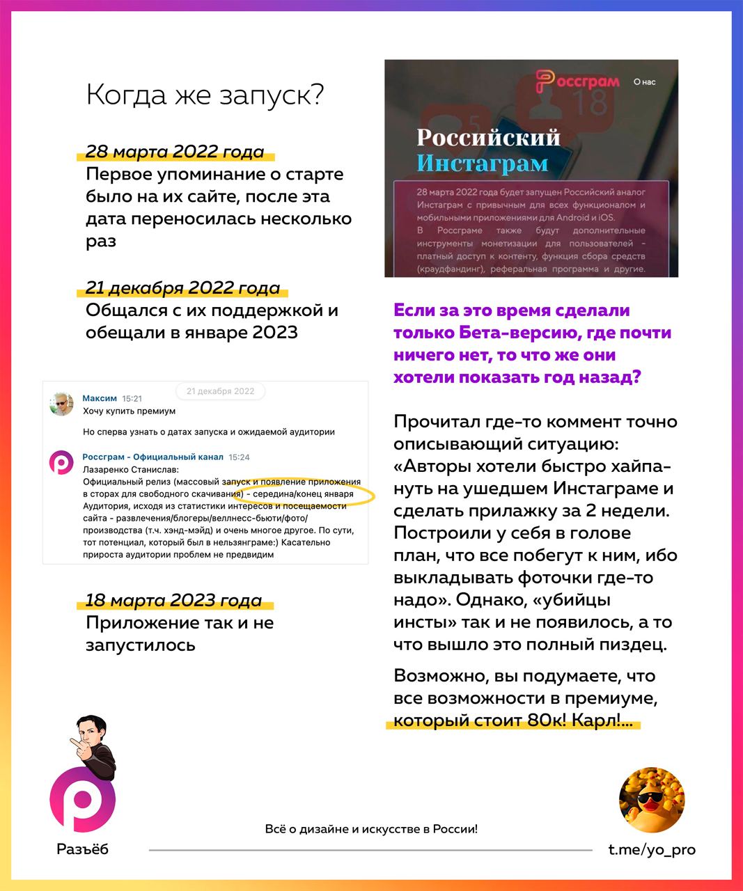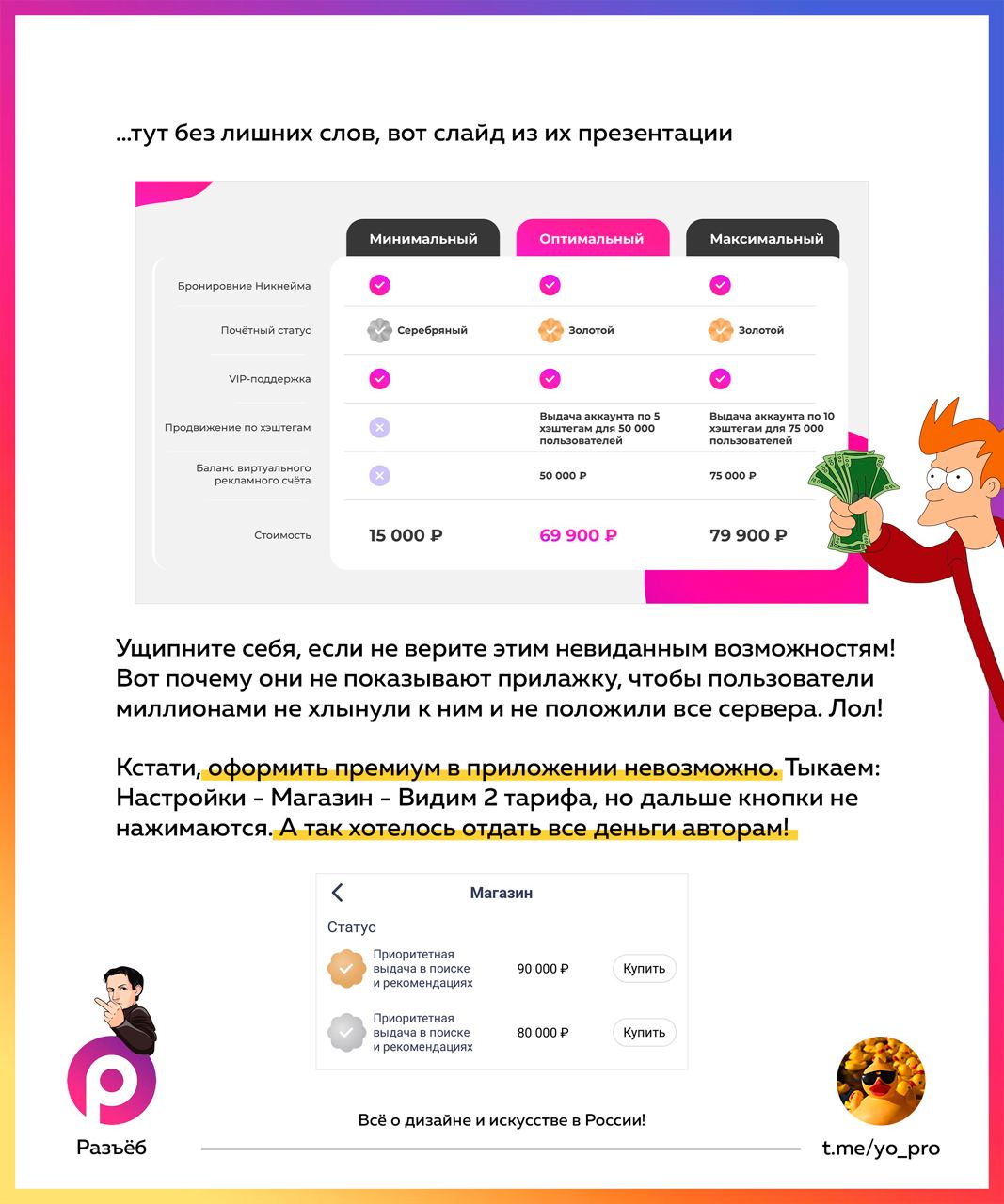 Это могло бы стать чем-то хорошим, если бы вера в дело, а не алчность создателей. Они с первого дня продают «премиумы» за 90к (в Телеге стоит — 300 р.!), обманывают с невиданными охватами и всячески ассоциируют себя с ушедшей Инстой.