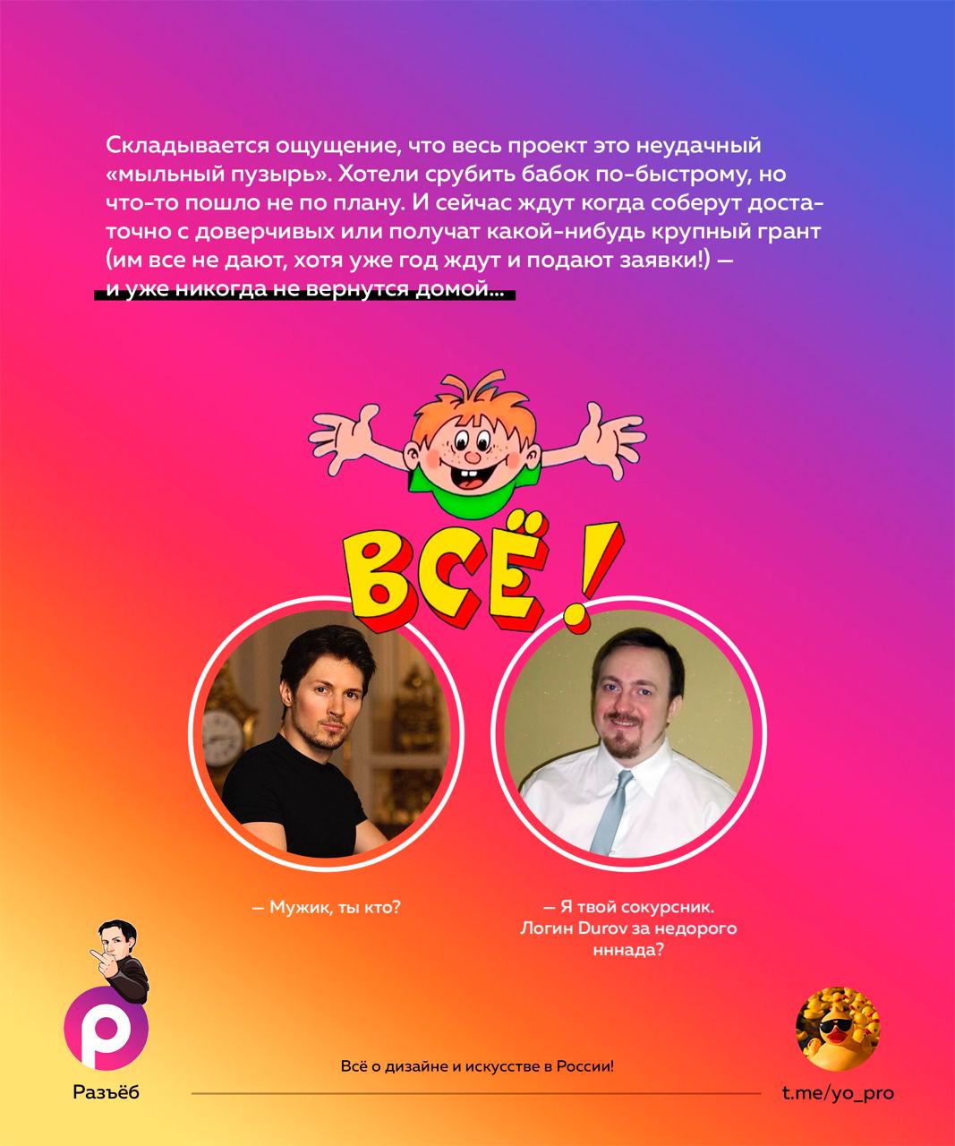 Я забрал себе логин Yo, просто зарегистрировавшись, а раньше они предлагали купить «уникальное имя» за полсотни тысяч. И вот новость от 15 марта 2023 года: «Соцсеть «Россграм» начала поиск инвесторов, пообещав доходность 950% за три года» — они его запустят, возможно даже не жестко обосрутся, но через три года не смогут сделать даже Сторис, поэтому хуй вам, а не 950% — скриньте.