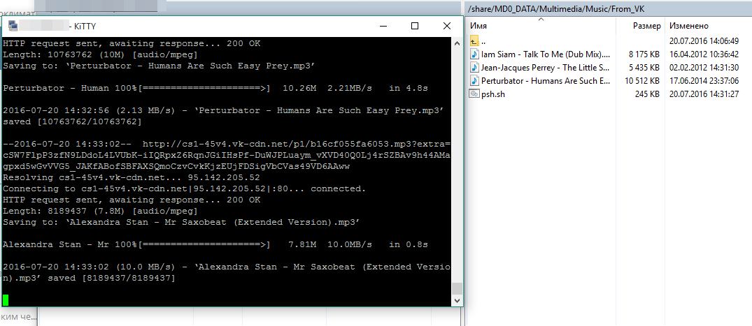 Короче, самый простой (для меня) вариант. Ставите расширение VkOpt для ВК, с помощью него генерируете ссылки для закачки через wget либо для винды, либо для линуха (виндовый вариант у меня ругается, решил через линь сделать).