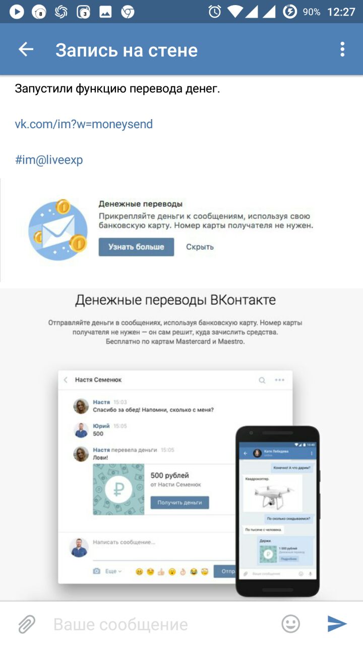 Отправляйте деньги в сообщениях, используя банковскую карту. Номер карты получателя не нужен — он сам решит, куда зачислить перевод. Подробнее: vk.cc/moneysend