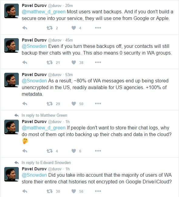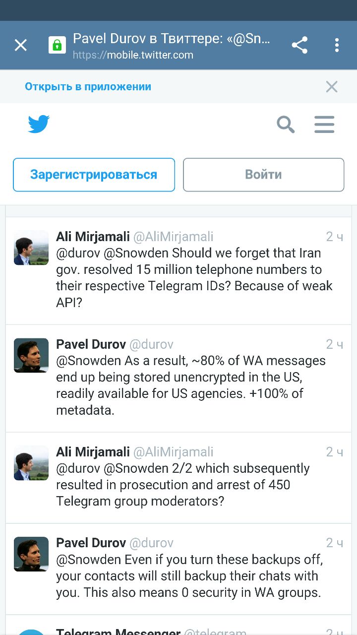А в это время Павел Дуров в Твиттере спорит с Эдвардом Сноуденом и Мэтью Грином по поводу «приватности» WhatsApp и хранения данных у США.
