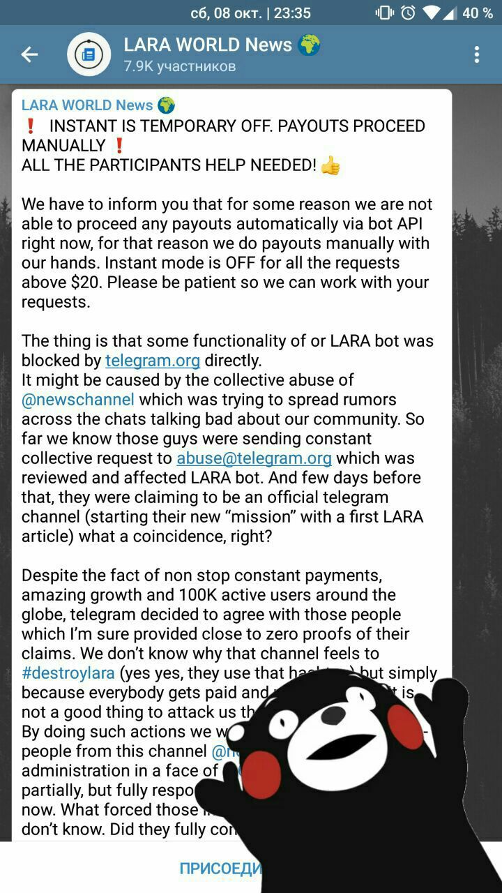 Слуште, тут писали что у бота Лара плашка появилась, что бот ненадежный