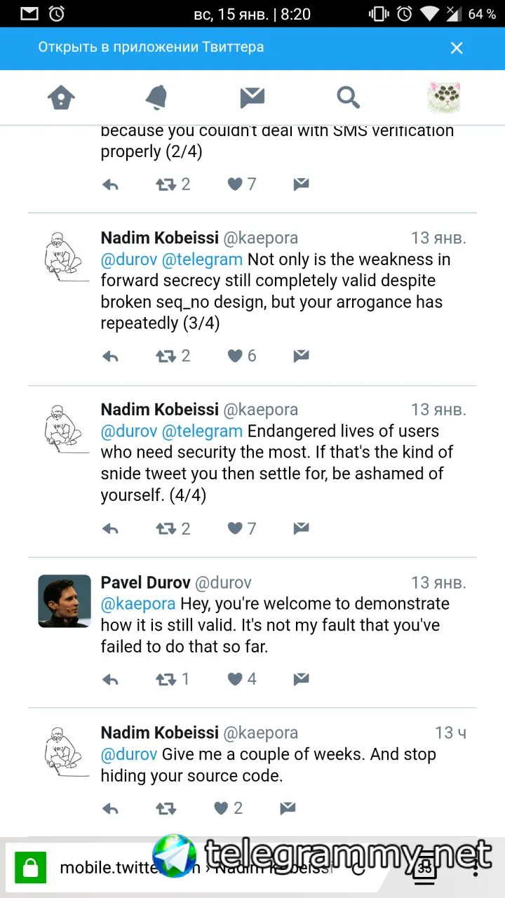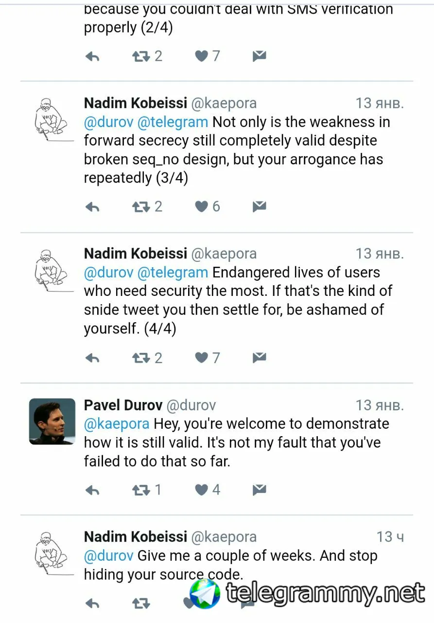 После дооолгих споров по поводу безопасности Telegram (начало где-то здесь: https://vk.cc/662Gzu) Надим всё-таки согласился показать взлом MTProto в течение нескольких недель.