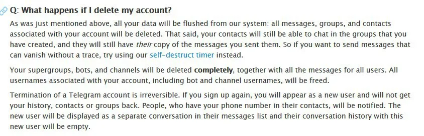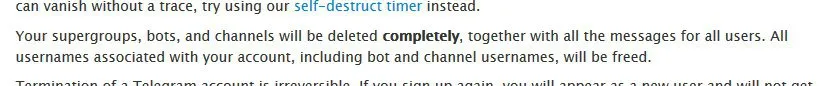 Там говорится что супергруппы, каналы и боты будут удалены полностью. Вместе со всеми сообщениями всех юзеров.