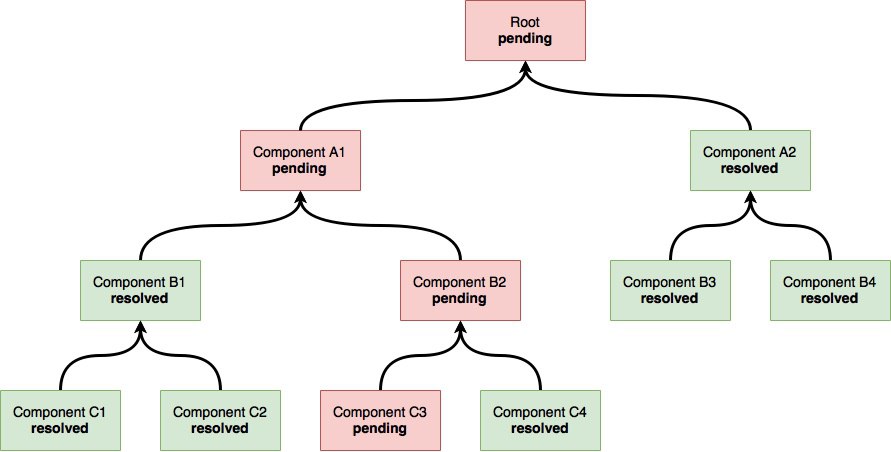все компоненты успели зарезолвиться кроме C3, когда зарезолвится C4, зареволвится и B2, следом за ним A1 и в конце концов Root и можно рендерить..