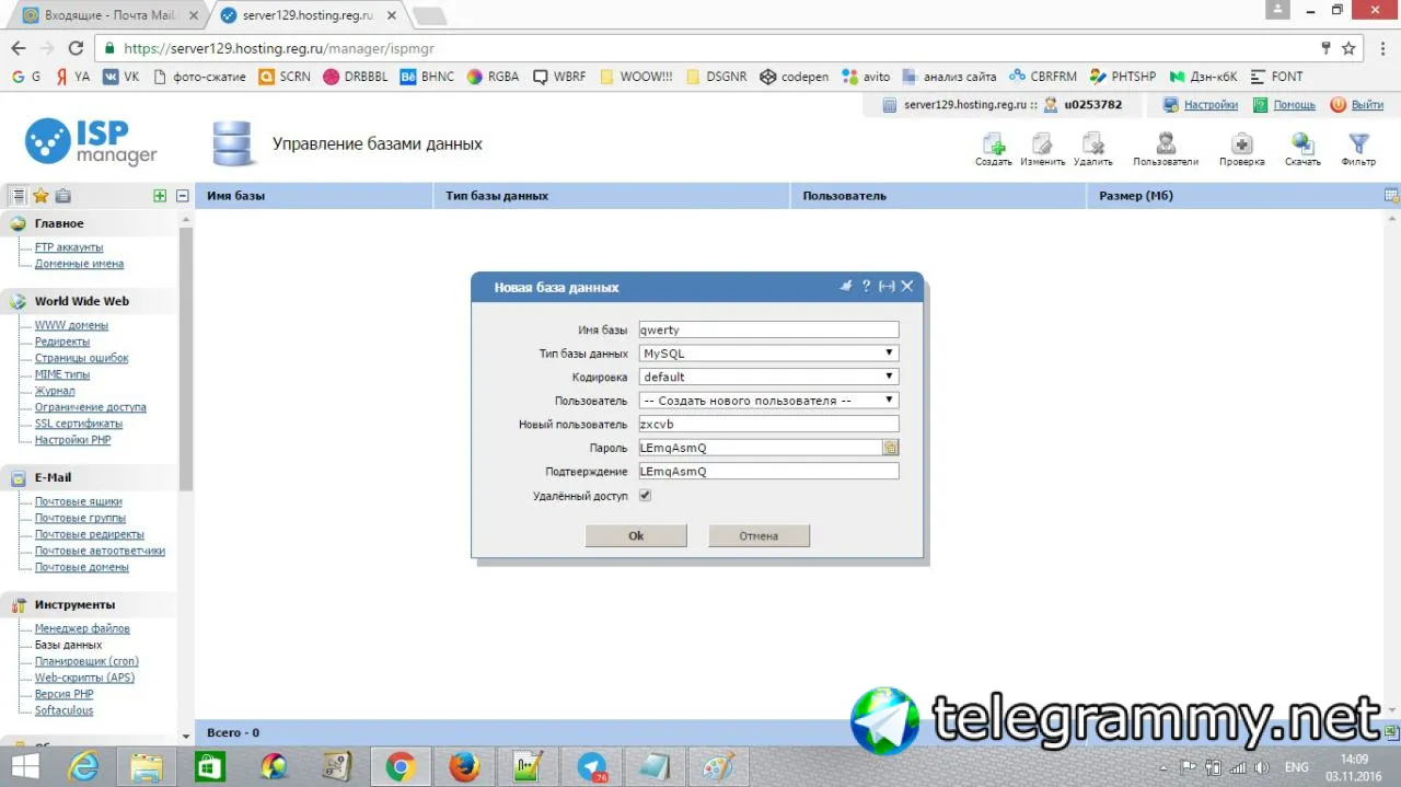 Влад создай базу через панель и пользователя к ней. Это исключит вероятность, что нет прав у пользователя