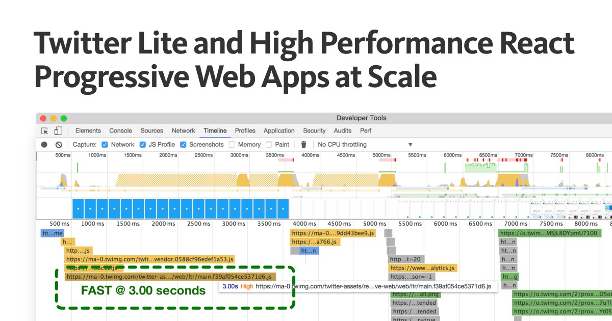 Как мы сделали Twitter Lite, Николас Галлахер рассказывает о новом PWA с офлайном и пушем на React и Redux — https://blog.twitter.com/2017/how-we-built-twitter-lite