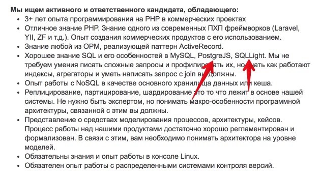 "Хорошее знание SQL и его особенностей в MySQL, PostgreJS" - wat?