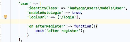 всем привет, что-то завис. использую модуль https://github.com/krivochenko/yii2-users хочу событие сделать после регистрации. пишу в main.php - 'on afterRegister' не работает, пробовал 'on afterConfirm' 'on afterSignup' - тоже не работает