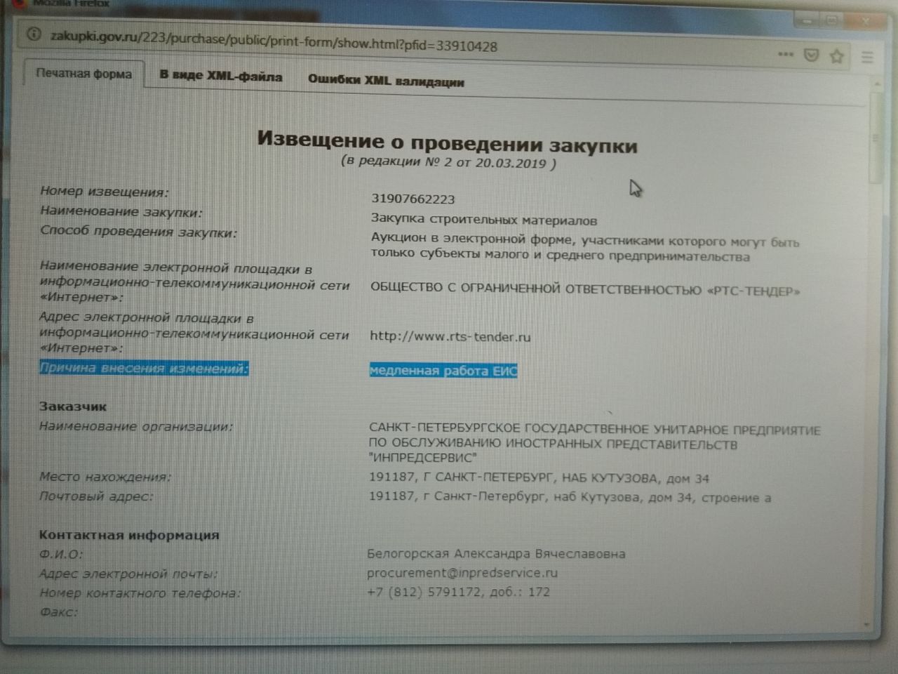Нами велась переписка с заказчиком. Заказчиком также не были оформлены допуски на объект наших сотрудников. После, заказчик направил письмо с уведомлением об одностороннем расторжении контракта ссылаясь на неисполнение подрядчиком обязательств по контракту. В рамках рабочего совещания было установлено что невозможно установить оборудование согласно ТЗ из-за зелёных насаждений которые не учтены в смутной документации. Решением ФАС было отказано заказчику нас включать в РНП.