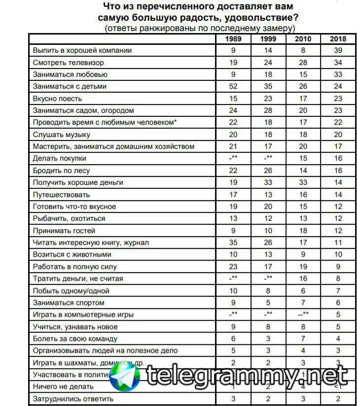 Три главные радости россиян – выпить, телевизор и секс. Хорошо заметно по сравнению с 1989 годом, как резко выросли эти три радости. И какое резкое падение «заниматься с детьми».