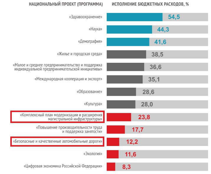 "Уровень исполнения бюджетных ассигнований на реализацию национального проекта «Безопасные и качественные автомобильные дороги» составил 12,2 %, Комплексного плана модернизации и расширения магистральной инфраструктуры (КПМИ) – 23,8 %, при этом не осуществлялись расходы по федеральным проектам КПМИ: «Европа – Западный Китай», «Транспортно-логистические центры» и «Высокоскоростное железнодорожное сообщение»".