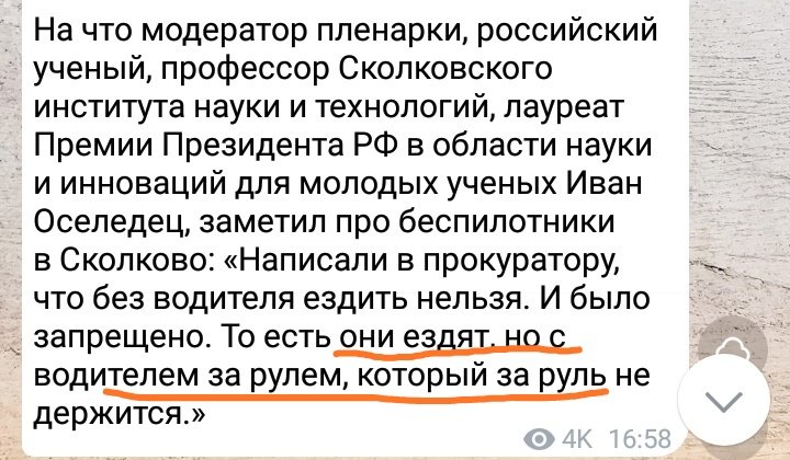 На что модератор пленарки, российский ученый, профессор Сколковского института науки и технологий, лауреат Премии Президента РФ в области науки и инноваций для молодых ученых Иван Оселедец, заметил про беспилотники в Сколково: «Написали в прокуратору, что без водителя ездить нельзя. И было запрещено. То есть они ездят, но с водителем за рулем, который за руль не держится.»