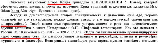 Описание татуировок Егора Крида приведено в ПРИЛОЖЕНИИ 5. Вывод, который сформулировали эксперты после их изучения: Крид типичный представитель движения Нью Эйдж (англ. New Age, буквально «новая эра»). Всех сторонников лжедвижения объединяет «великое преобразование», наступление новой эпохи, которая должна прийти на смену современной культуре. Утверждается, что эта грядущая культура гораздо более совершенна и должна ознаменоваться якобы грандиозным скачком в духовном, мыслительном и технологическом развитии человечества. По некоторым оценкам это движение берёт начало в масонской организации. КРИД -creed (в переводе с английского означает кредо, вера, убеждения), т. к. негласный лозунг этого движения: «Человек – мера всех вещей». Главный принцип – свобода личных критериев в оценке всех явлений жизни. Полностью отвергаются традиции и устои общества, в т. ч. семейные ценности.