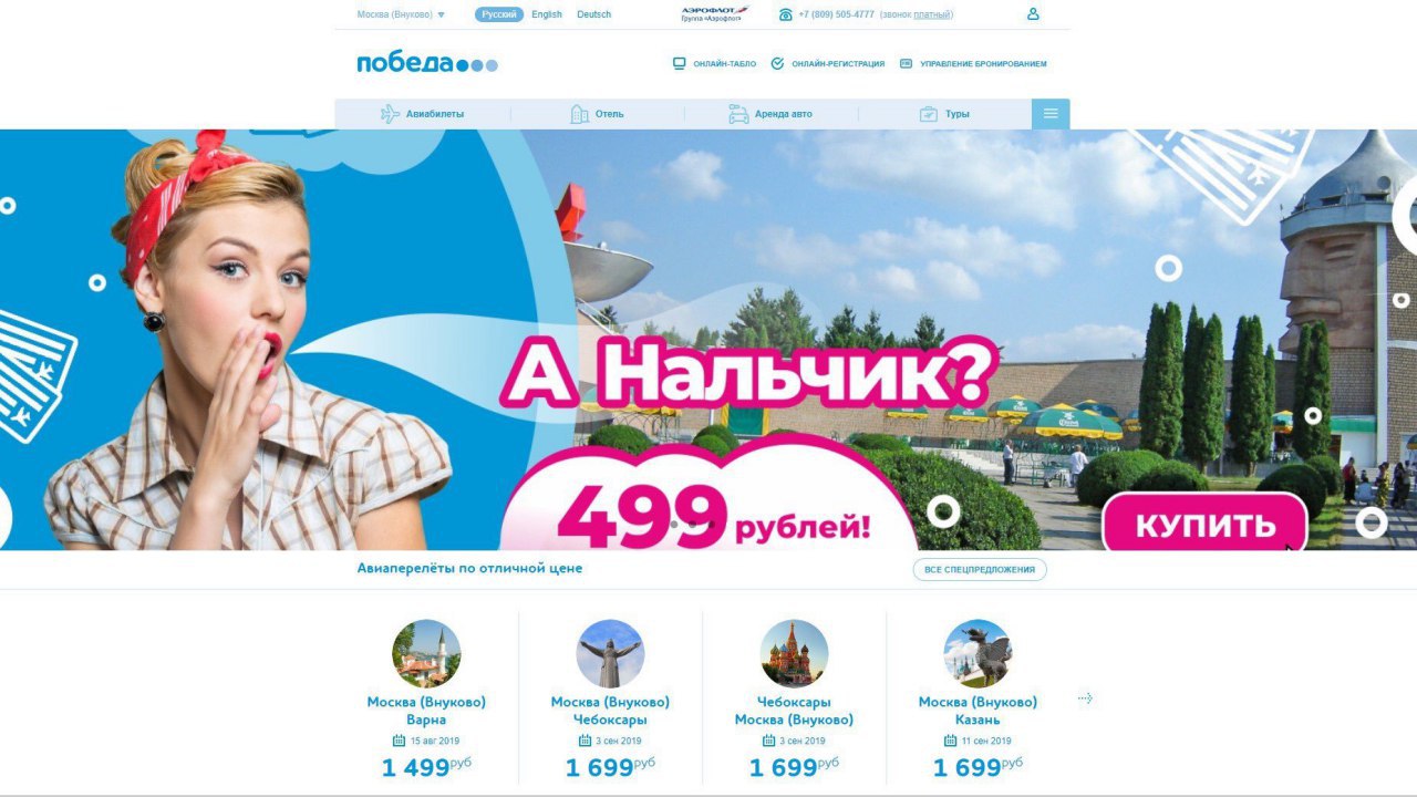 Авиакомпания «Победа» устроила акцию, в рамках которой у россиян будет возможность купить 200 тысяч билетов по ценам от 499 до 1999 рублей. Распродажа стартовала 12 августа и из-за наплыва посетителей сайт «Победы» слетел. Спустя пару часов его подняли и на главной странице появилась очень неоднозначная реклама билетов в Нальчик.