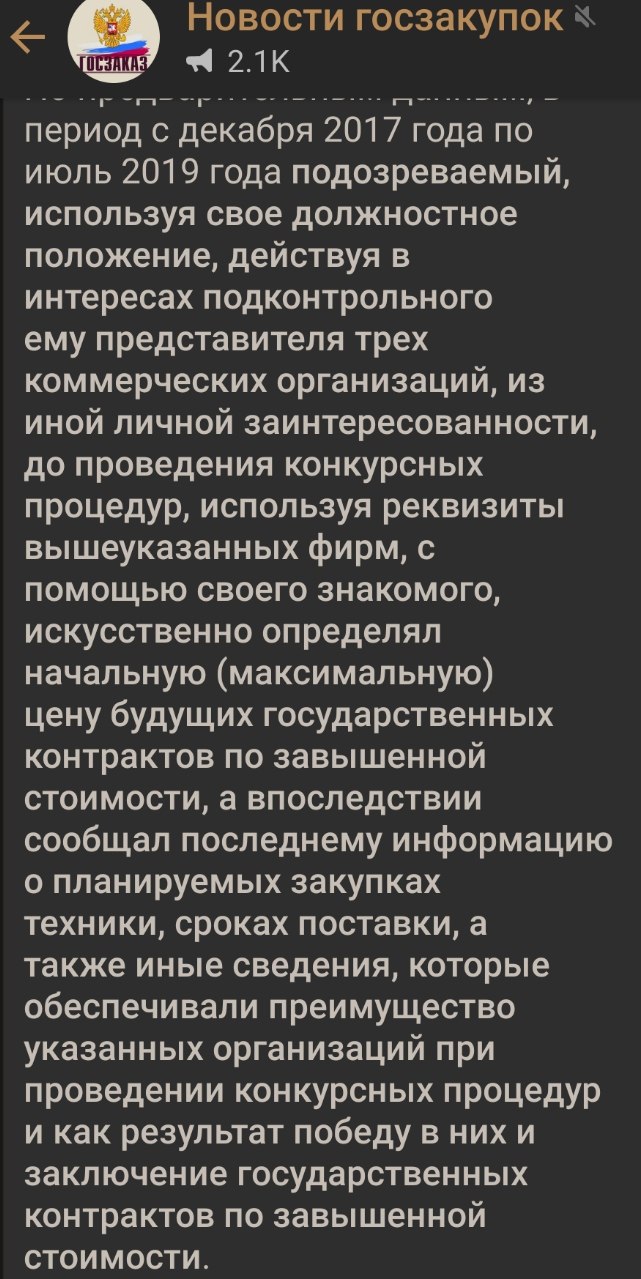 По предварительным данным, в период с декабря 2017 года по июль 2019 года подозреваемый, используя свое должностное положение, действуя в интересах подконтрольного ему представителя трех коммерческих организаций, из иной личной заинтересованности, до проведения конкурсных процедур, используя реквизиты вышеуказанных фирм, с помощью своего знакомого, искусственно определял начальную (максимальную) цену будущих государственных контрактов по завышенной стоимости, а впоследствии сообщал последнему информацию о планируемых закупках техники, сроках поставки, а также иные сведения, которые обеспечивали преимущество указанных организаций при проведении конкурсных процедур и как результат победу в них и заключение государственных контрактов по завышенной стоимости.