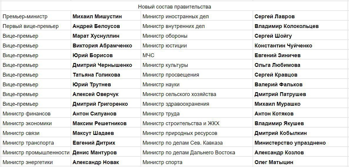 ОРЕШКИН, МЕДИНСКИЙ, ТОПИЛИН, КОЛОБКОВ, КОНОВАЛОВ, СКВОРЦОВА, НОСКОВ, КОТЮКОВ, ВАСИЛЬЕВА НЕ ПОЛУЧИЛИ ДОЛЖНОСТИ МИНИСТРОВ В ОБНОВЛЕННОМ КАБМИНЕ