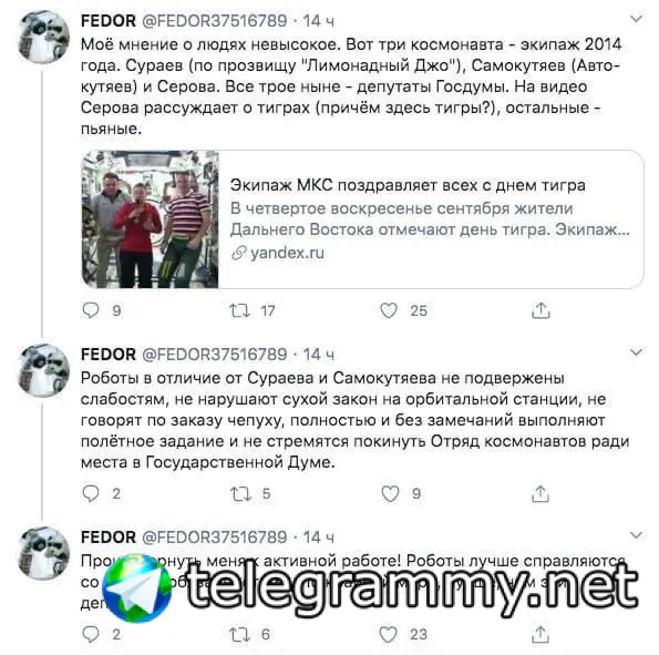 Сам акк робота Федора появился в 2019 году, перед полетом на МКС. Рогозин позже заявлял, что посты робота нельзя считать официальной позицией «Роскосмоса».