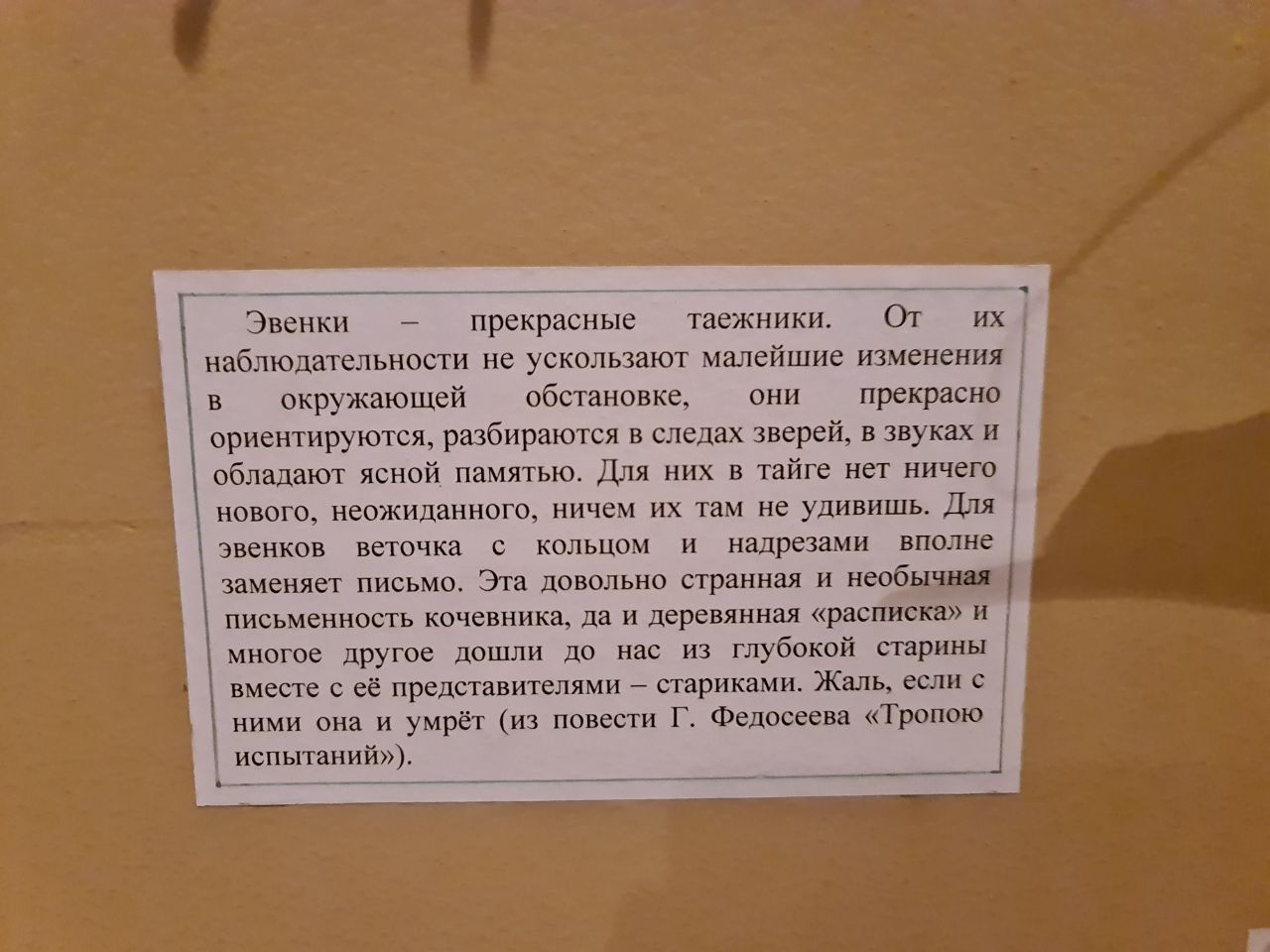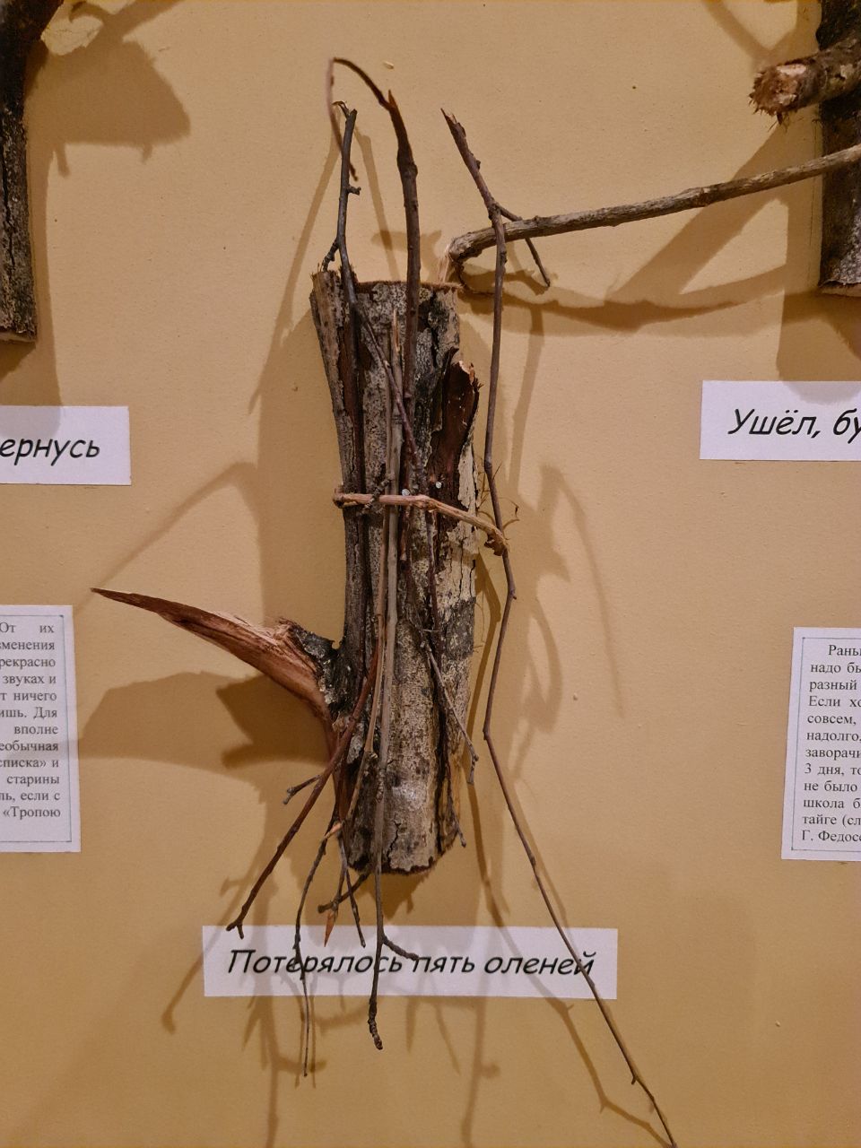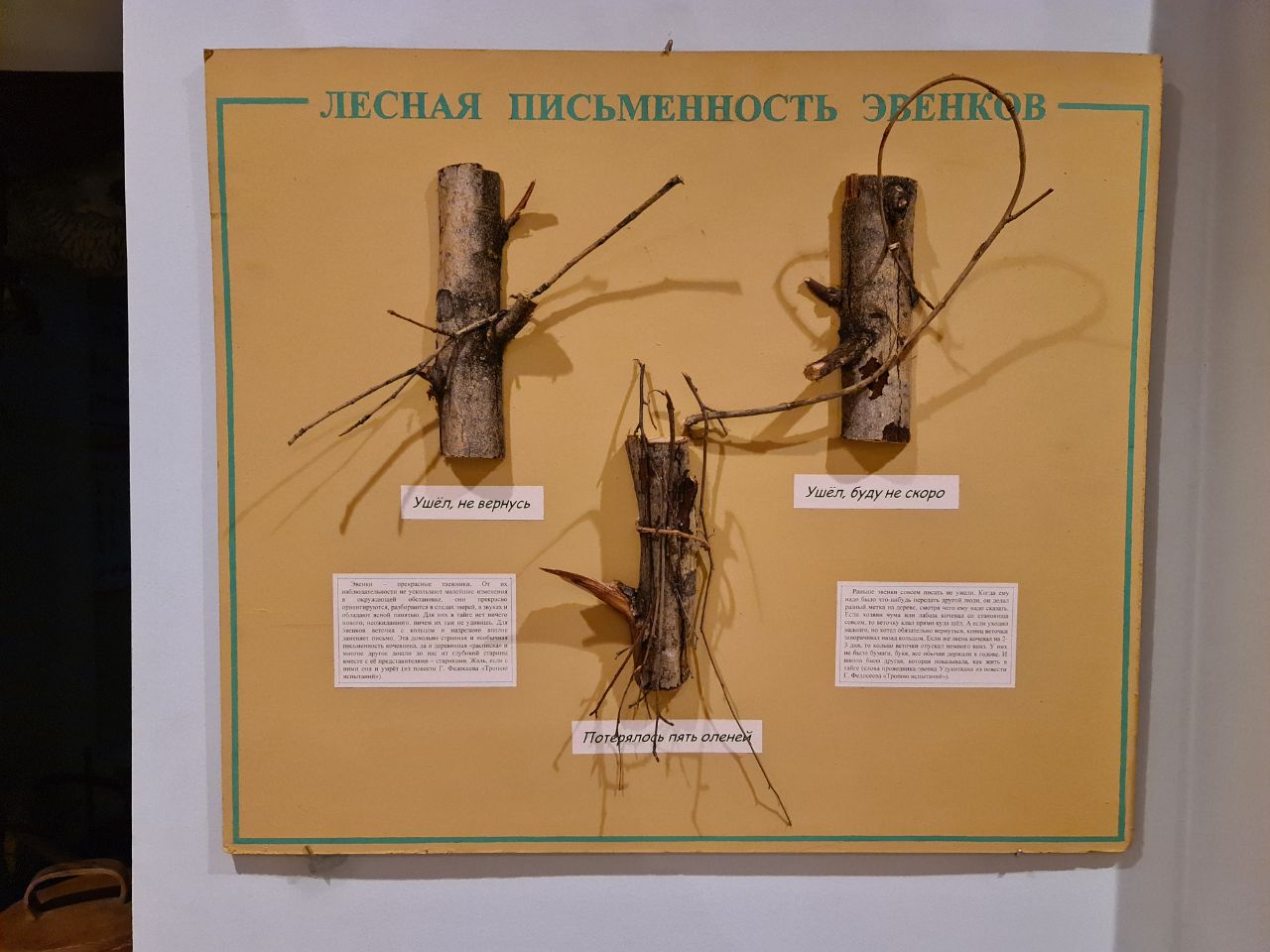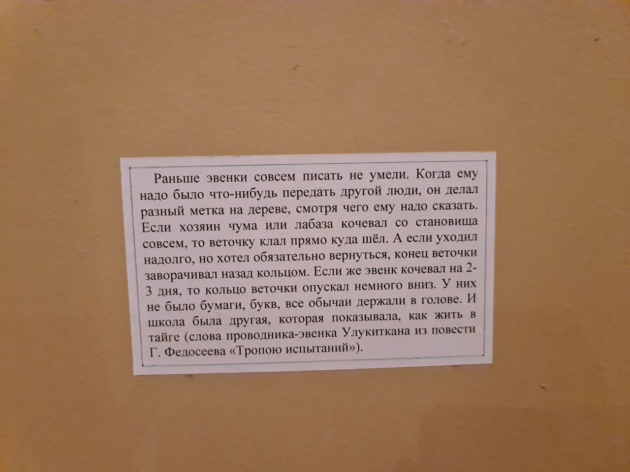 "Ушел, не вернусь". "Ушел, буду не скоро". "Потерялось пять оленей". Лесная письменность эвенков, представленная в музее истории БАМа в Тынде, даёт пищу для самого разнузданного творчества. Только представьте, как выглядели бы отчёты по нацпроектам: "Средства освоены", "Средства освоены частично", "Подрядчики — олени" и т.д.