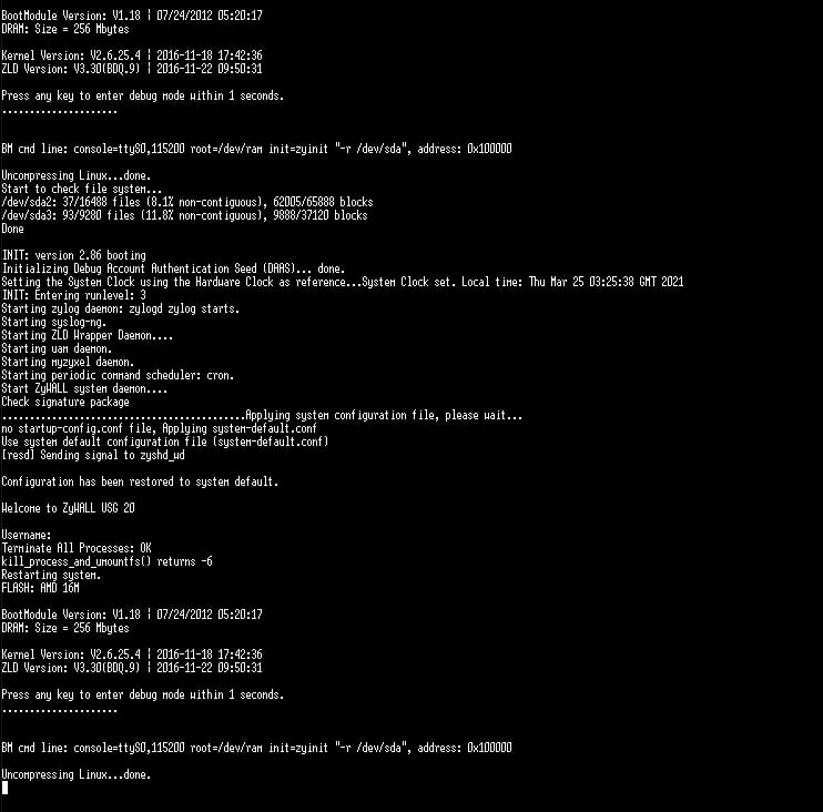 ZyWALL system is configured successfully with system-default.conf