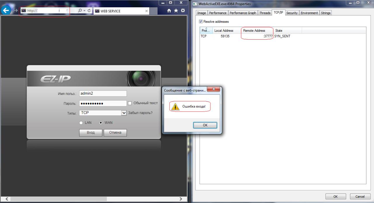 После установки плагина в процессах появляется WebActive.exe и когда снова входишь по паролю на регистратор, то в этот момент WebActive.exe подключается к белому IP на TCP 37777. Но ему никто не отвечает (отсутствует правило проброса на 37777) и выдаёт ошибку как на скриншоте выше "Ошибка входа".