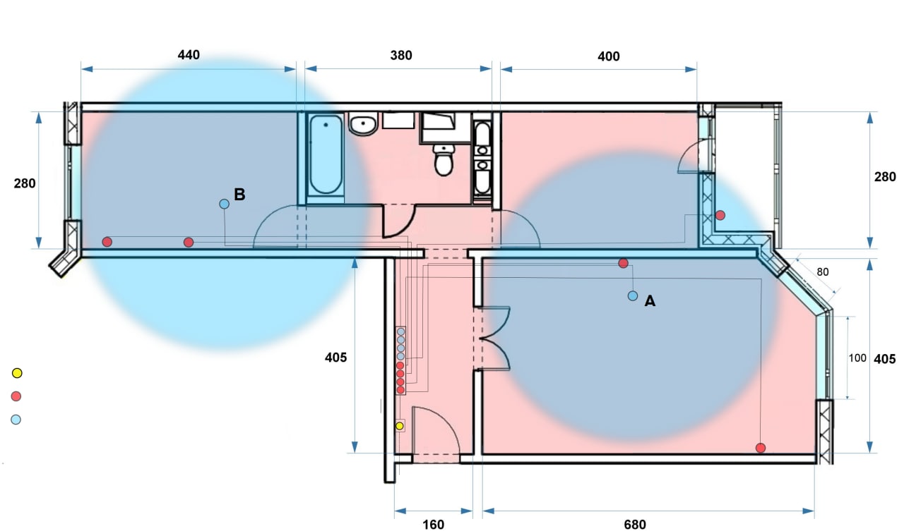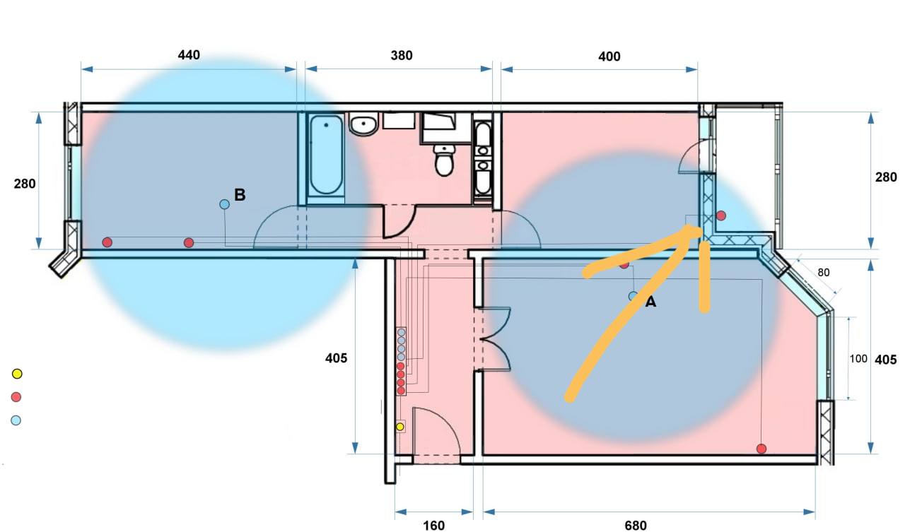 Но лучше сначала потестируйте перед установкой и увидите, в каком положении лучше ловит. Вдруг между ванной и комнатой А будет отражать сигналы.