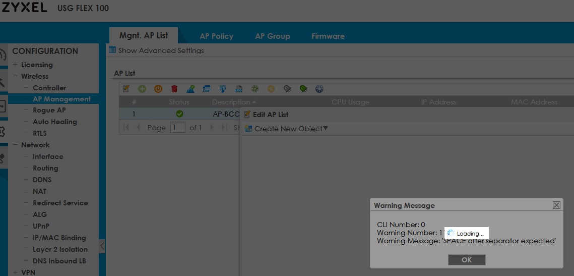 Что за печаль. Настроил точку доступа WAC6103D-I через USG FLEX100. Все пркрасно работает но при входе в настройки выдает такое и интерфейс зависает (прошивка новая и там и там). Ткните по расшифровке этого сообщения где в конфиге что смотреть? Warning Message: 'SPACE after separator expected'
