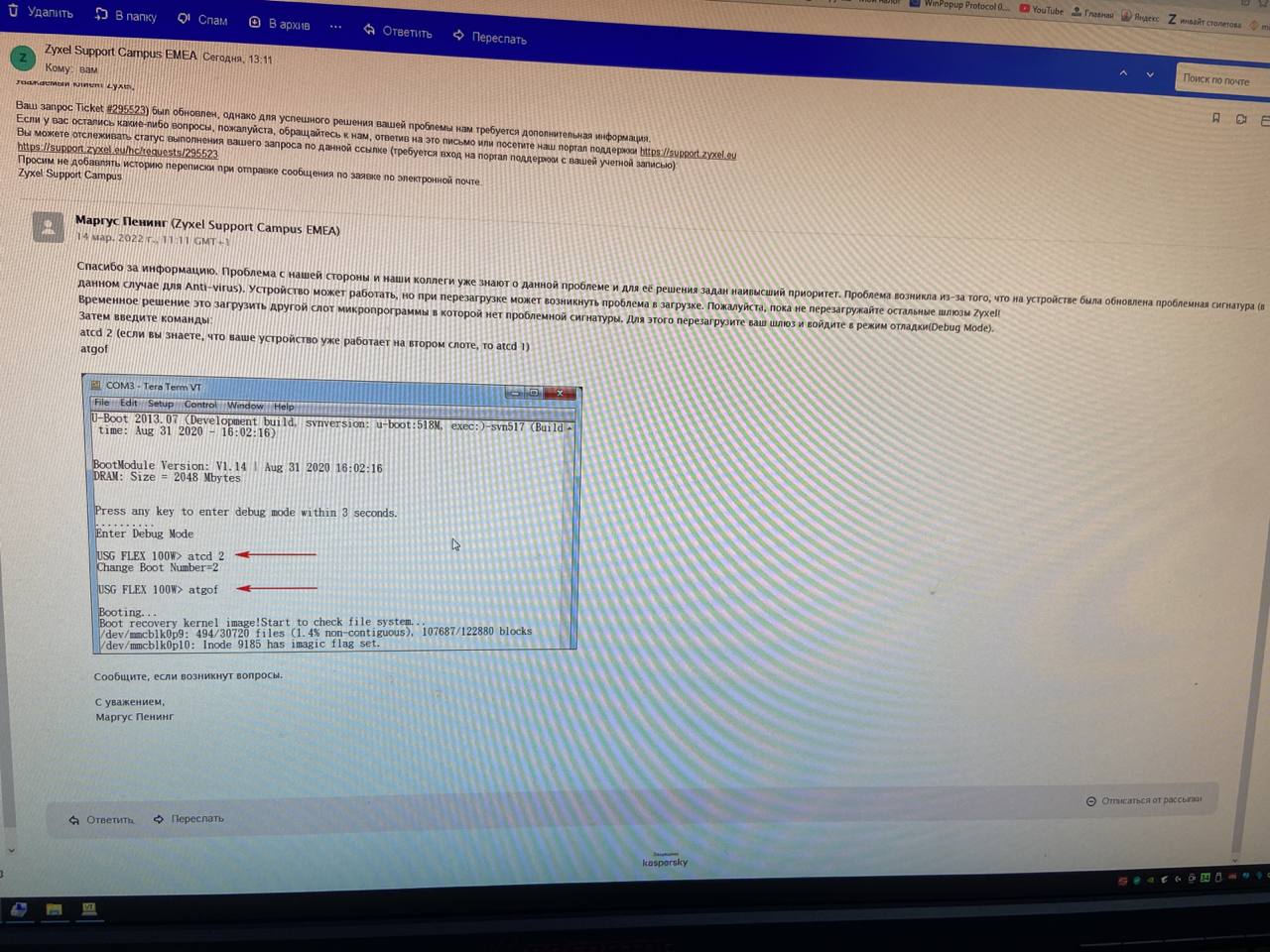 Пока проблема была замечена на серии устройств USG FLEX/ATP. Шлюзы функционируют как обычно до их перезагрузки. Если шлюзы из этой серии получили последнее, проблемное обновление сигнатур и были перезагружены, то есть вероятность что они могут не загрузиться до конца (если смотреть консольный лог то доходит до процесса load av threat info...). Т.е. микропрограмма загружается и прерывается на процессе проверки сигнатур, до загрузки конфигурации процесс не доходит. HQ уже в курсе и занимаются решением. Пока есть временное, обходное решение - загрузить шлюз через другой слот микропрограммы.